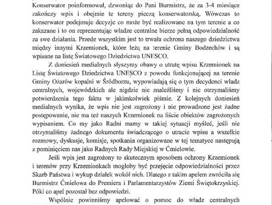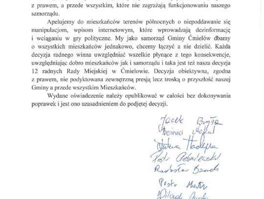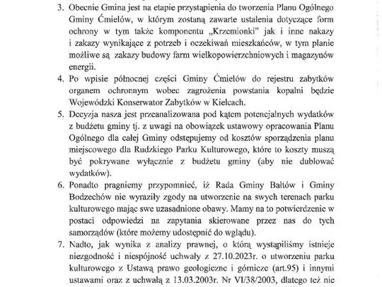 W oświadczeniu jakie podpisało 12 radnych można przeczytać, że "...radni nie mając wyjścia podjęli uchwałę uchylającą uchwałę w sprawie utworzenia Rudzkiego Parku Kulturowego na terenach północnych gminy Ćmielów zdejmując tym samym ciężar odpowiedzialności ewentualnych zobowiązań finansowych wynikających z odszkodowań stanowiących poważne zagrożenie destabilizacji i utraty płynności finansowej przez Gminę..."