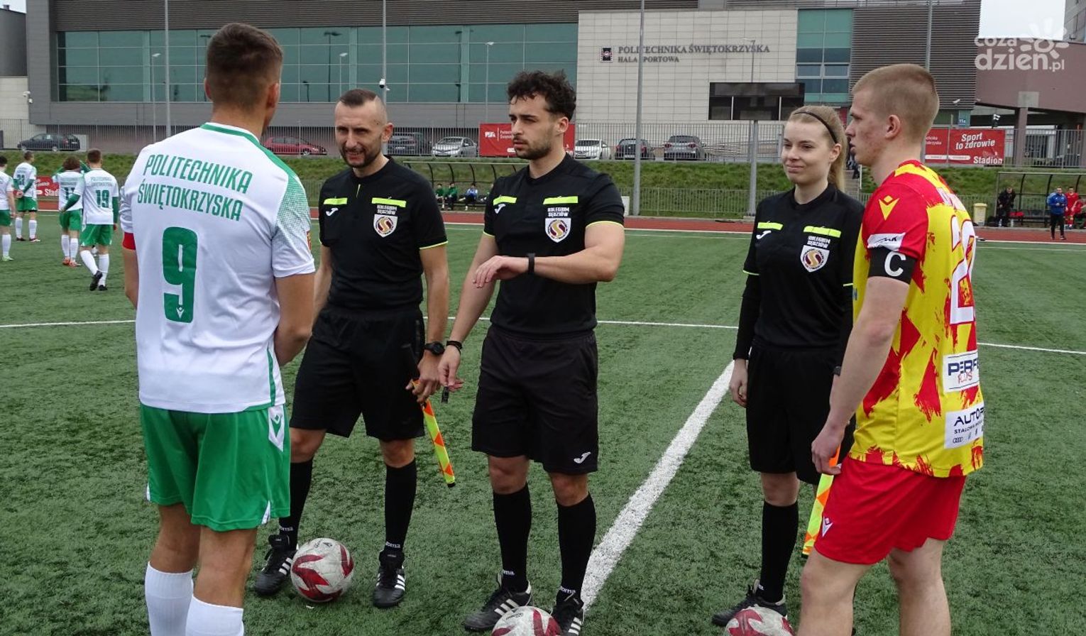 Mało kto spodziewał się, że drużyna Politechniki będzie w stanie postawić się liderowi tabeli klasy A grupy 1. Ekipa Artura Obarzanka przez długi czas była zespołem dobrze zorganizowanym, a co najważniejsze, nie popełniała większych błędów w defensywie. Taki błąd za to przydarzył się młodej ekipie KKP Korony i do przerwy było 0:1 dla gości tego spotkania.