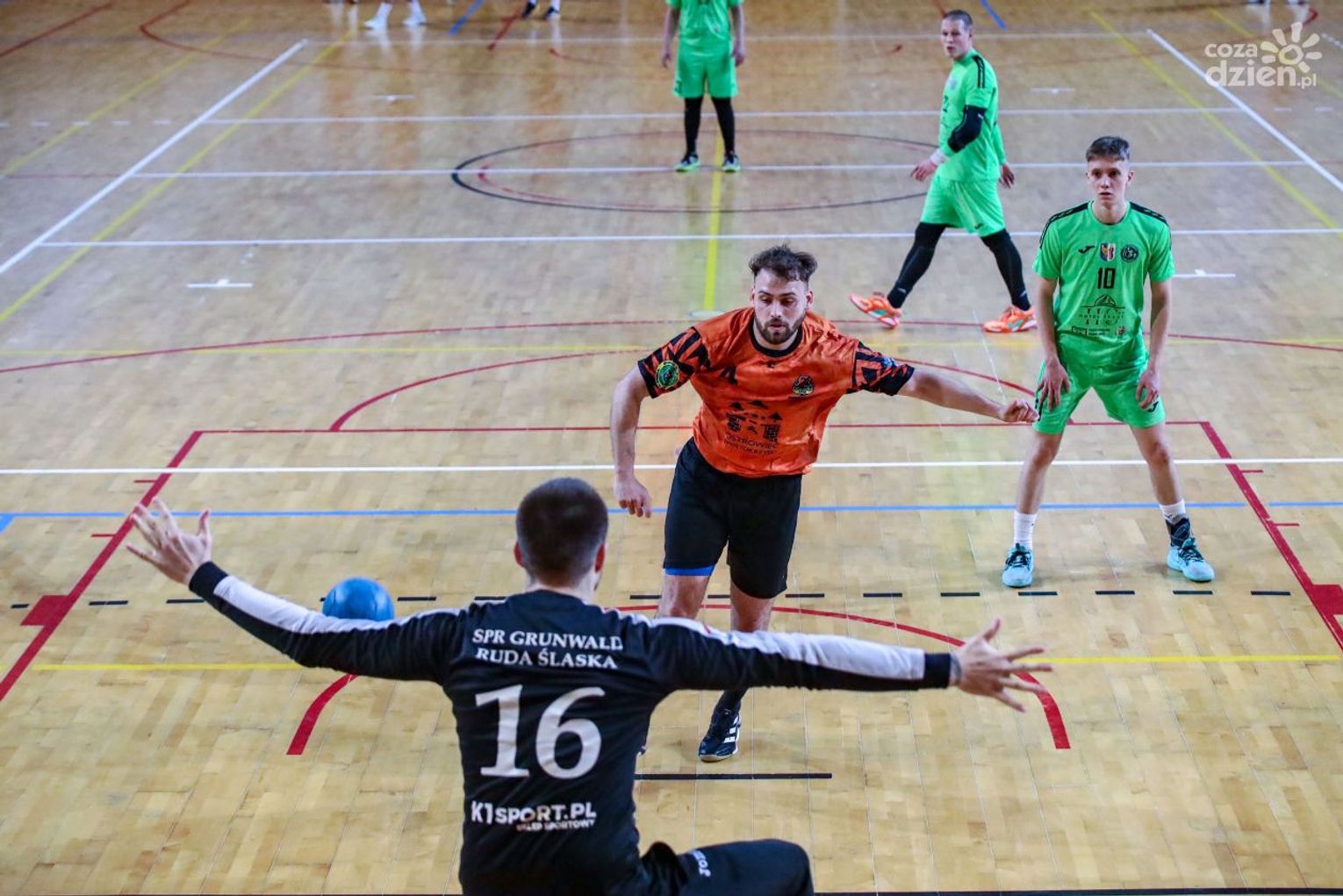 Wojownicy dobrze rozpoczęli spotkanie, już po kilku minutach po bramkach Zdziecha, Makuły i Bysiaka prowadzili 4:1. Zajmujący ostatnie miejsce w ligowej tabeli zespół Grunwaldu nie był w stanie nawiązać wyrównanej walki. Na przerwę gospodarze schodzili z pięcioma bramkami przewagi. W drugiej części spotkania obraz gry nie uległ zmianie, dopiero w końcówce spotkania przyjezdni rzucili kilka bramek, niwelując przewagę KSZO do czterech bramek. Najskuteczniejszymi zawodnikami w barwach ostrowieckiego klubu byli Mateusz Bysiak i Jakub Makuła. Obaj zdobyli po sześć bramek. W spotkaniu z Grunwaldem, w KSZO nie zagrali narzekający na urazy Adrian Wojkowski, Filip Chmielewski i Michał Piątkowski.
