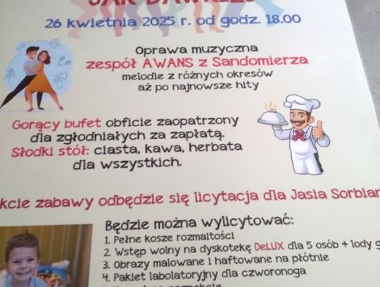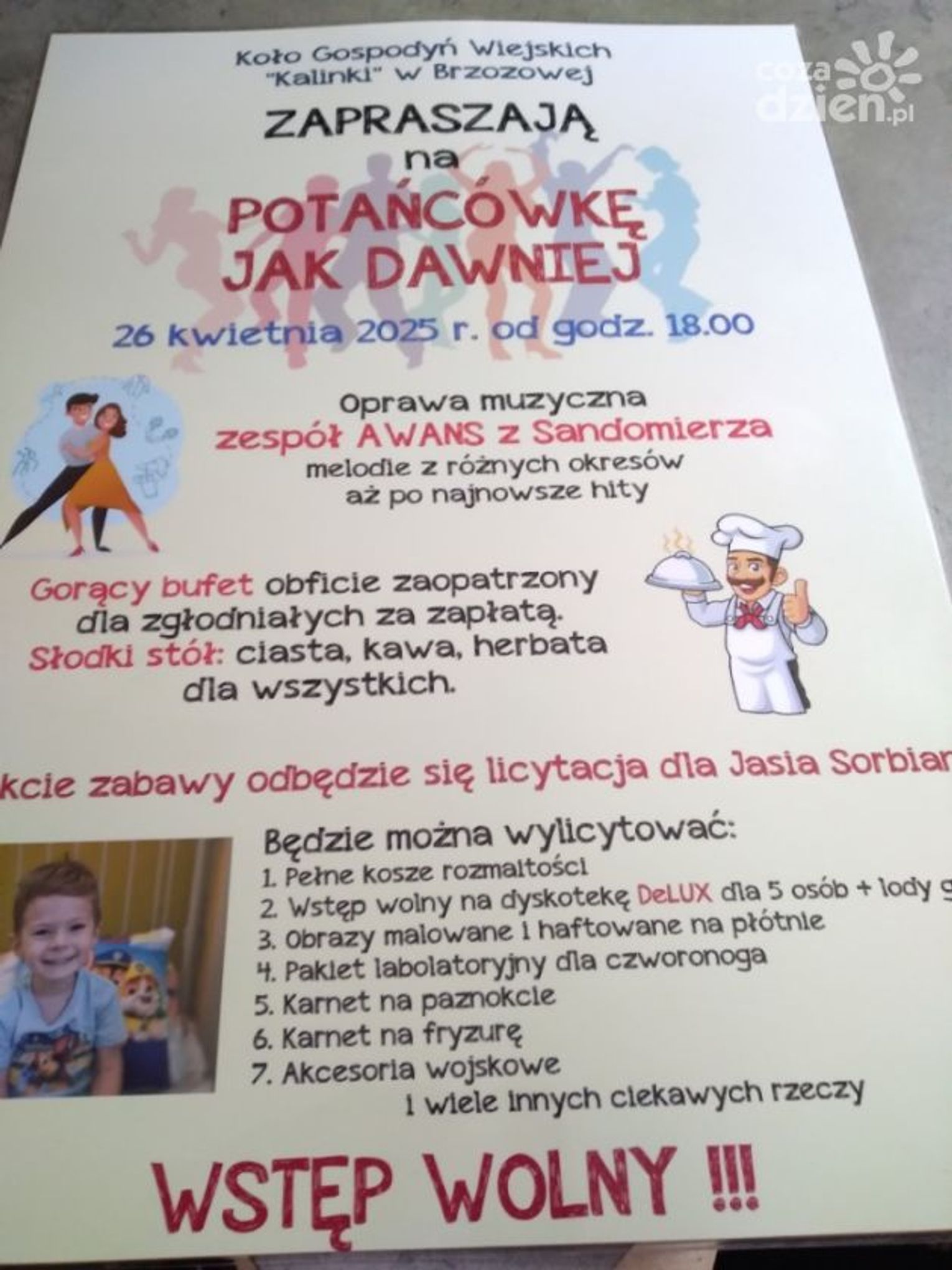 A wiosenna potańcówka odbędzie się 26 kwietna, w siedzibie KGW Kalinki w Brzozowej w gminie Tarłów. Zbiórka pieniędzy na dalsze dalsze leczenie Jasia Sorbiana prowadzona jest też na portalu Sie Pomaga i trwa do maja.