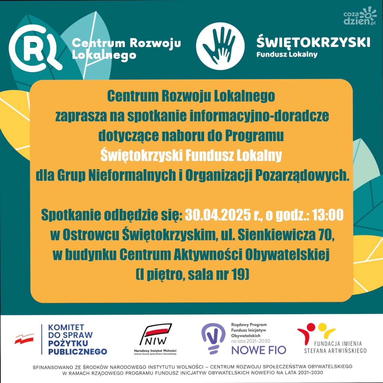 Masz pomysł na projekt, ale brakuje Ci środków na jego realizację? Przyjdź na bezpłatne spotkanie informacyjne organizowane przez Centrum Rozwoju Lokalnego, poświęcone wsparciu finansowemu, jakie można pozyskać ze Świętokrzyskiego Funduszu Lokalnego na rozwój organizacji lub grupy nieformalnej.