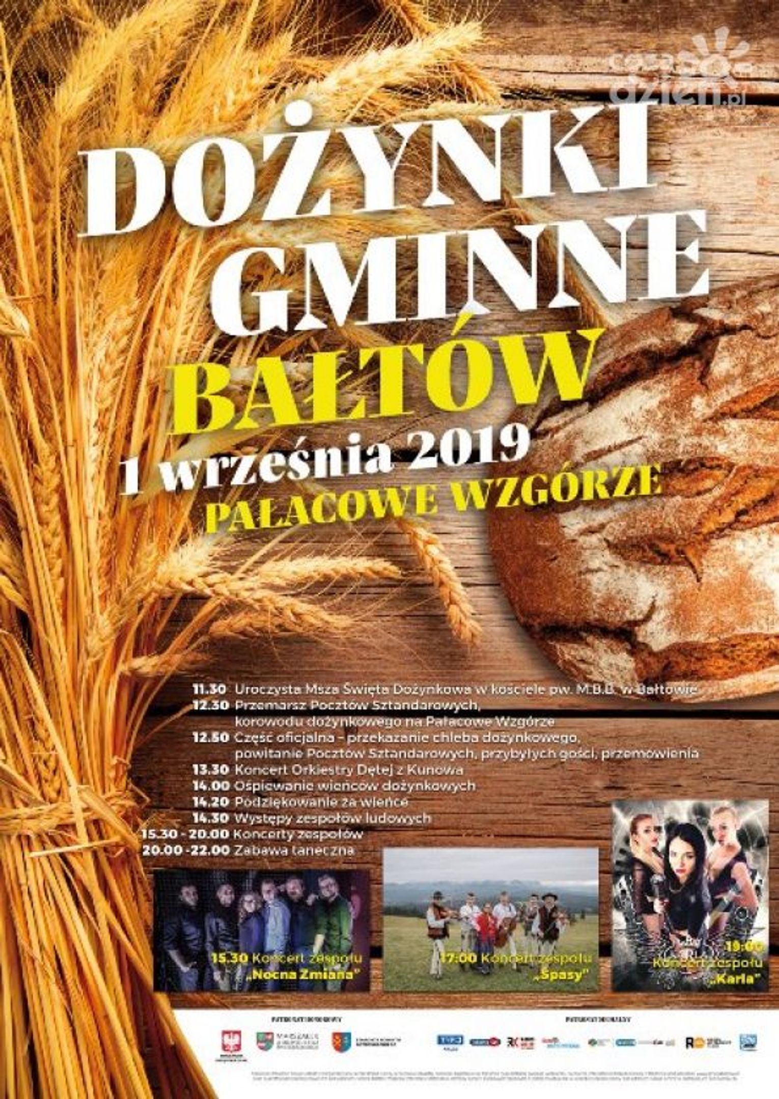 Święto plonów rozpocznie uroczyste nabożeństwo odprawione w kościele pw. Matki Boskiej Bolesnej w Bałtowie (godz. 11.30). Po mszy świętej nastąpi przemarsz korowodu dożynkowego na Wzgórze Pałacowe. W części oficjalnej starostowie przekażą na ręce wójta Huberta Żądło chleb, wypieczony z tegorocznych zbóż. Będą też okolicznościowe przemówienia i podziękowania dla rolników. O godz. 13.30 rozpocznie się koncert Orkiestry Dętej z Kunowa, a bezpośrednio po nim - zespoły ludowe z terenu gminy ośpiewają wieńce dożynkowe. Od godz. 15.30 sceną będą rządzić formacje muzyczne. Najpierw pojawi się "Nocna zmiana". Od godz. 17 gości porwie do zabawy zespół "Śpasy". Na godz. 19 zaplanowano koncert grupy Karla. Całość zwieńczy zabawa taneczna pod gwiazdami.