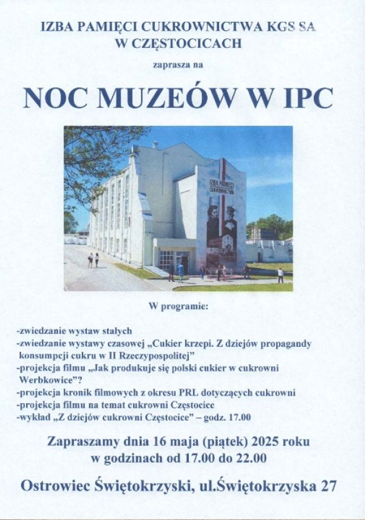 W piątek, 16 maja od godziny 17 do 22 w placówce mieszczącej się na terenie dawnej cukrowni Częstocice będzie więc można zwiedzać wystawy stałe i tymczasową noszącą tytuł "Cukier krzepi. Z dziejów propagandy konsumpcji cukru II Rzeczpospolitej".