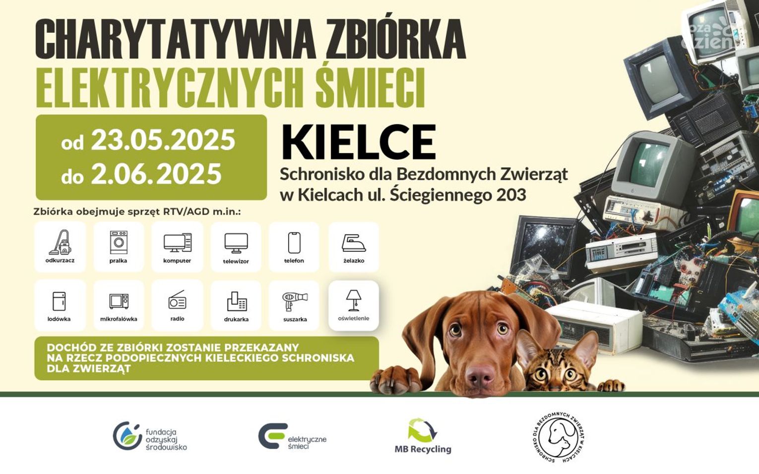 „Elektryczne śmieci to najszybciej rosnący strumień odpadów na świecie. Globalnie każdego roku produkujemy prawie 54 miliony ton zużytego sprzętu elektrycznego i elektronicznego. Niestety, warto pamiętać, że tylko ok. 17 % poddawana jest recyklingowi. Zbiórki charytatywne na rzecz podopiecznych Schroniska dla bezdomnych zwierząt w Kielcach to świetna okazja dla mieszkańców, by bezproblemowo pozbyli się elektrycznych śmieci, jednocześnie pomagając zwierzętom w potrzebie i chroniąc środowisko naturalne. Zapraszam wszystkich mieszkańców Kielc i okolic do majowych porządków” – mówi Kinga Rodkiewicz z Fundacji Odzyskaj Środowisko.