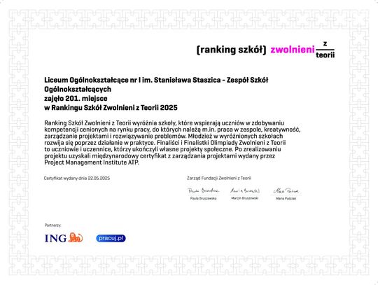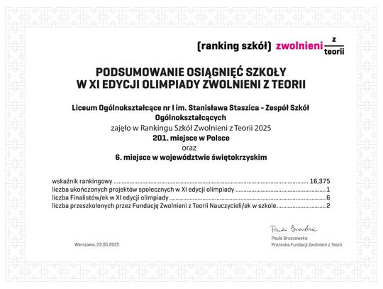 Uczennice Staszica zostały finalistkami Olimpiady "Zwolnieni z Teorii"." Zwolnieni z Teorii" to ogólnopolska olimpiada praktyczna dla szkół ponadpodstawowych, w której uczniowie realizują autorskie projekty o charakterze społecznym. W ten sposób zdobywają praktyczne umiejętności i wiedzę, które mogą być przydatne w przyszłej pracy i na studiach.