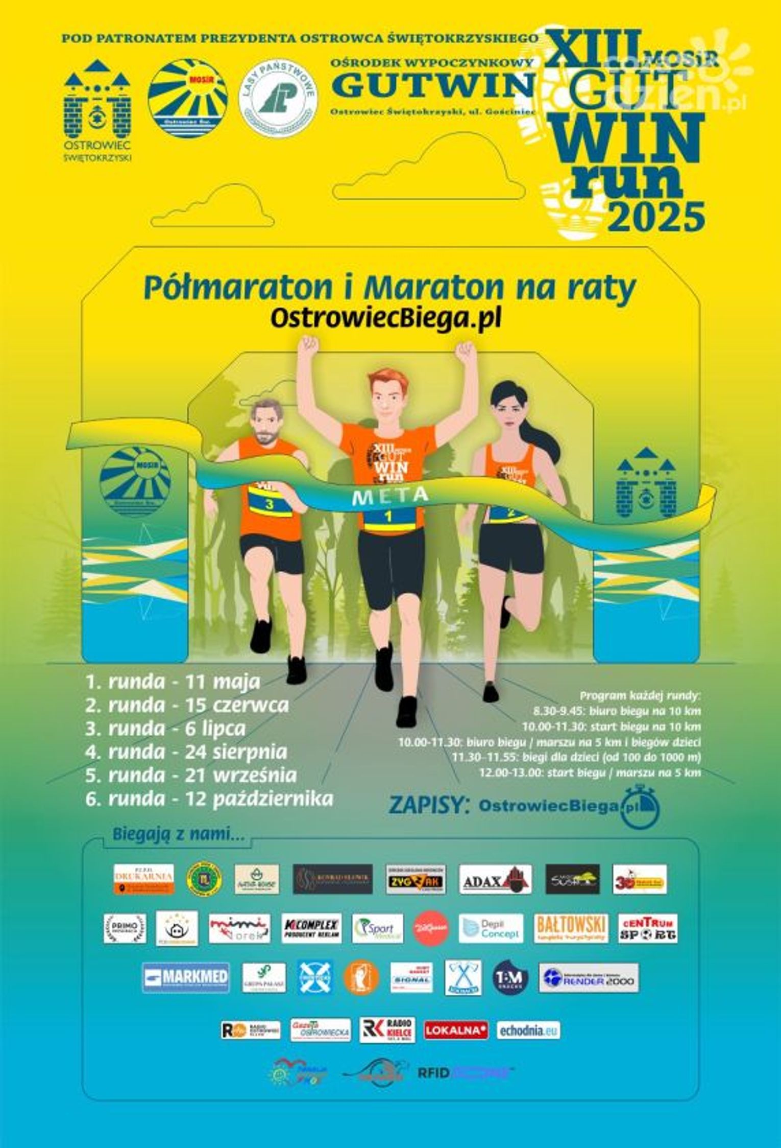 Zapisy prowadzone są na dwa sposoby. Osoby z przypisanym już numerem startowym (zapisane na 1. rundę, bez względu na to czy finalnie wzięły w niej udział), wypełniają uproszczony formularz potwierdzający udział w 2. rundzie, w którym deklarują dystans i konkurencję. Z poziomu formularza można wybrać jeden lub oba dystanse, łącząc je w dowolnej konfiguracji (biegi na 10 i 5km lub bieg na 10km i marsz na 5km). Pełny formularz ze wszystkimi niezbędnymi w procesie rekrutacji do imprezy danymi osobowymi wypełniają wyłącznie osoby, które zamierzają wystartować w tegorocznym cyklu po raz pierwszy i nie były zapisane na premierową rundę, która odbyła się w maju. Najmłodszych (do 13 roku życia) zapisujemy wyłącznie w dniu imprezy (w biurze zawodów), w towarzystwie rodzica lub opiekuna prawnego dziecka. Przed każdą rundą, w biurze zawodów, przyjmowane są również zgłoszenia drużyn do klasyfikacji rodzinnej. Przypominamy, że aby zostać sklasyfikowanym w całym cyklu, należy zaliczyć udział w co najmniej czterech z sześciu rund, kompletując maraton i/lub półmaraton na raty. Maraton na raty zaliczymy biegnąć czterokrotnie dystans ok. 10km, a półmaraton na raty zaliczymy biegnąć lub maszerując czterokrotnie dystans ok. 5km. Jak co roku na każdego komu ta sztuka się uda czeka nagroda w postaci atrakcyjnego medalu oraz okolicznościowej koszulki. Najszybsi mogą ponadto liczyć na nagrody rzeczowe ufundowane przez licznych partnerów imprezy. Kolejne rundy XIII MosirGutwinRun 2025 odbędą się 6 lipca, 24 sierpnia, 21 września i 12 października. Patronat honorowy: Prezydent Ostrowca Świętokrzyskiego Artur Łakomiec i Nadleśnictwo Ostrowiec Świętokrzyski.