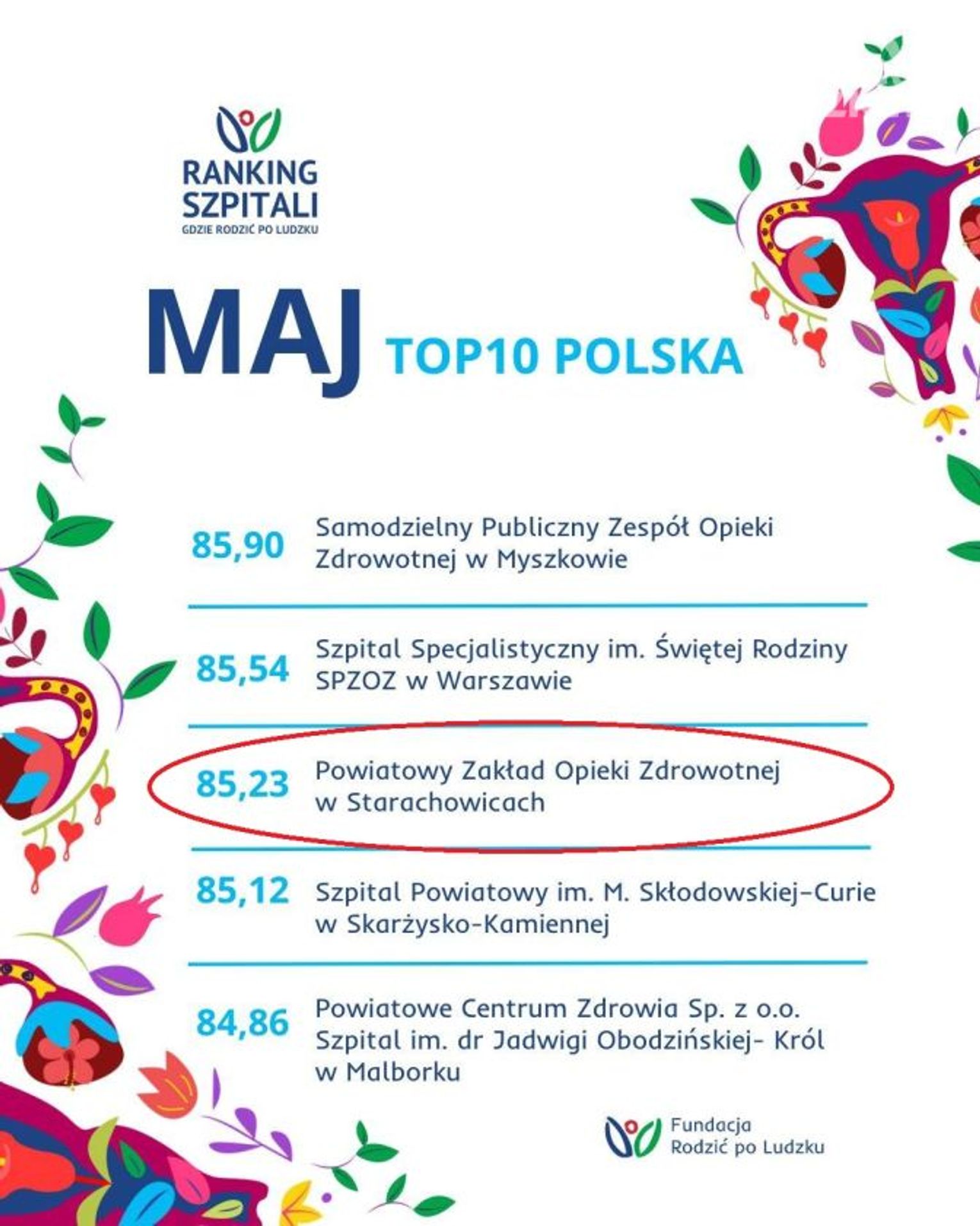 - Zostaliśmy po raz kolejny sklasyfikowani na trzecim miejscu w ogólnopolskim rankingu "Top 10 najlepszych oddziałów położniczych w Polsce", tym razem za maj tego roku. Ranking powstał na podstawie opinii kobiet, które urodziły w polskich szpitalach i wypełniły ankiety dostępne na stronie fundacji. Wysoka pozycja naszego oddziału to dla nas ogromne wyróżnienie i potwierdzenie, że troska, empatia oraz wysoki standard opieki są zauważalne i doceniane przez nasze pacjentki- mówiła Małgorzata Kałuża z Powiatowego Zakładu Opieki Zdrowotnej w Starachowicach.