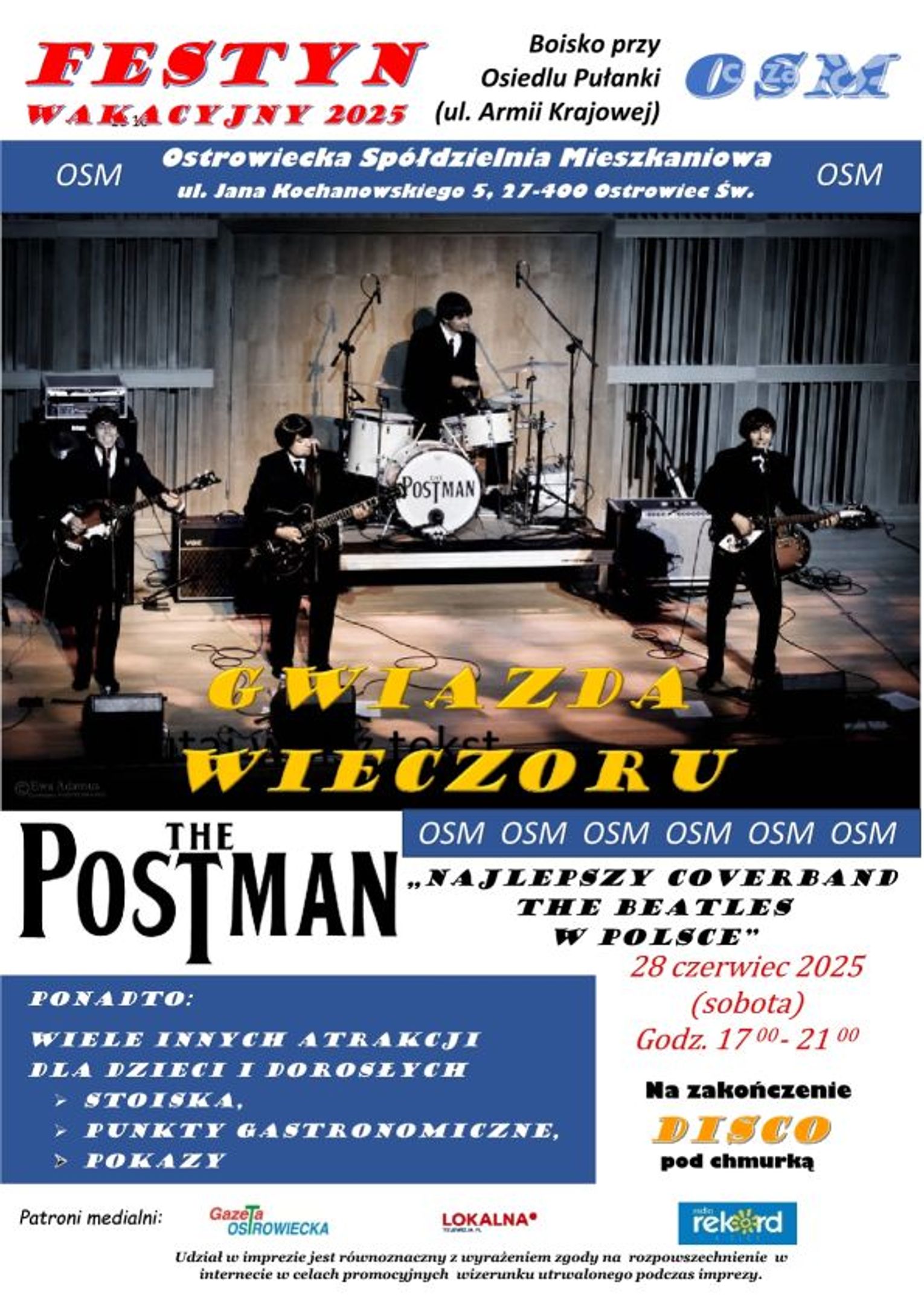 W sobotę, 28 czerwca 2025 roku Ostrowiecka Spółdzielnia Mieszkaniowa zaprasza na "Festyn Wakacyjny". Impreza odbędzie się na boisku przy osiedlu Pułanki w Ostrowcu Świętokrzyskim – start o godzinie 17:00!
