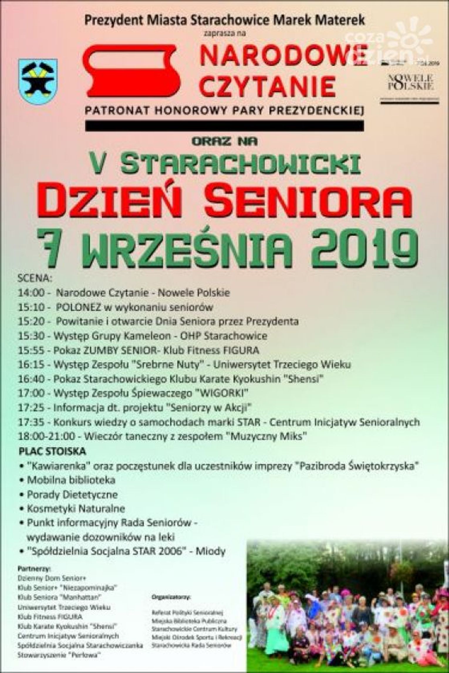 oo godzinie 15.00 rozpoczną się obchody V Starachowickiego Dnia Seniora, który rozpocznie się Polonezem w wykonaniu Seniorów. W programie również: pokazy sportowe: Zumba- Klub Fitness Figura , Karate-SKKK Senshi ; występy wokalane: Kameleon, Wigorki, Srebrne Nuty oraz stoiska informacyjne i poczęstunek. Spotkanie zakończy się wieczorem tanecznym przy akompaniamencie zespołu "Muzyczny Miks".