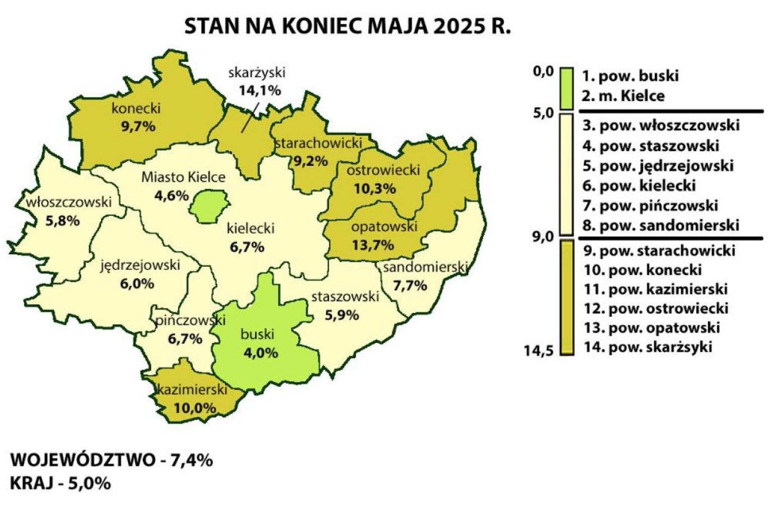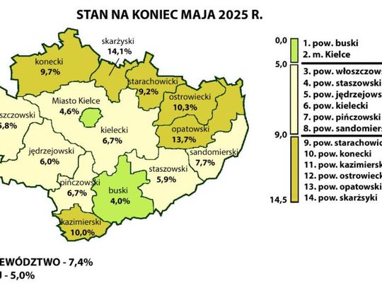 Duże różnice widać także na poziomie powiatów. Najniższą stopę bezrobocia odnotowano w powiecie buskim (4,0%) oraz w Kielcach (4,9%). Z kolei najtrudniejsza sytuacja panuje w powiecie opatowskim, gdzie bezrobocie sięga aż 13,7%, oraz w skarżyskim — 14,1%. To ponad trzykrotnie więcej niż w najlepiej rozwiniętych częściach regionu.