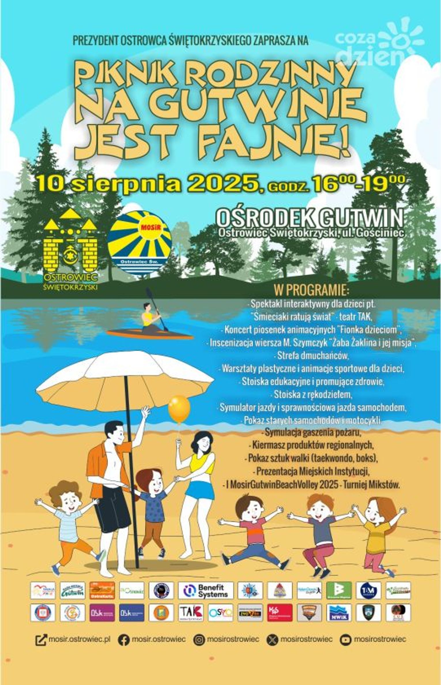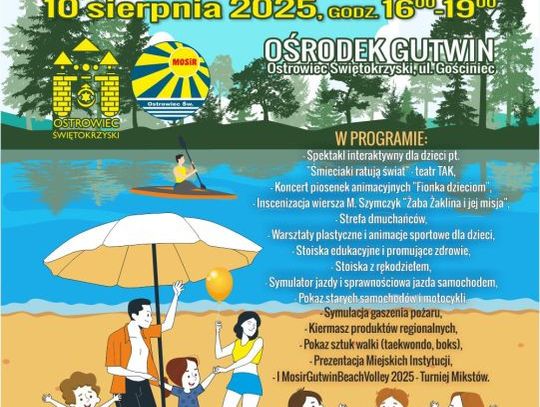 Główną atrakcją dla najmłodszych będzie spektakl interaktywny pt. „Śmieciaki ratują świat” w wykonaniu Teatru TAK z Radomia, podczas którego mały widz pozna sposoby na ratowanie planety i nauczy się prawidłowej segregacji śmieci. Dla całych rodzin zaplanowane są różne warsztaty plastyczne, konkursy i animacje prowadzone przez zaproszone instytucje, malowanie buziek, zaplatanie warkoczyków, tworzenie żaby Żakliny, rysowanie itp. Nie zabraknie również licznych konkursów i gier sprawnościowych prowadzonych przez animatorów i instruktorów MOSiR. Dla najmłodszych będą dostępne bezpłatne dmuchańce, a dla nieco starszych przygotowano pokazy taekwondo (Akademia Młodego Wojownika) i Sekcji Bokserskiej KSZO. Można będzie też zakosztować i zakupić ekologiczne wyroby z „Jacentowskiej Piwniczki”. Uczestnikom pikniku czas umili koncert piosenek dla dzieci „Fionka dzieciom”. Dodatkowo swoje stanowiska zaprezentują: Benefit Systems (gadżety), Stowarzyszenie Diabetologiczne (pomiar cukru, ciśnienia), Policja (radiowóz), Straż Pożarna (wóz ratowniczy i symulacja gaszenia pożaru), Straż Miejska, Urząd Miasta Wydział Ekologii i Infrastruktury, Miejskie Wodociągi i Kanalizacja (stoisko z saturatorem), Warsztaty Terapii Zajęciowej SZANSA (prace własne), Krajowa Administracja Skarbowa w Kielcach, Fundacja Z SERCA –MARTA KŁONICA, Centrum Pozytywnego Nauczania Marta Kłonica, Miejska Biblioteka Publiczna (inscenizacja wiersza „Żaba Żaklina i jej misja”), Buro Wystaw Artystycznych, Ośrodek Szkolenia Kierowców ZYGZAK, Rada Osiedla Gutwin, Fundacja „Bo w nas jest MOC” (koło fortuny), Powiatowa Stacja Sanitarno-Epidemiologiczna, Centrum Usług Społecznych (warsztaty dla dzieci), Klub Przyjaciół Dawnych Samochodów Singiel (pokaz starych samochodów i motocykli), TBM SNACKS (zabawy i malowanki). W trakcie pikniku wszystkich miłośników sportu zapraszamy na rozgrywany Turniej Mikstów – I MosirGutwinBeachVolley 2025 (cykl turniejów siatki plażowej).