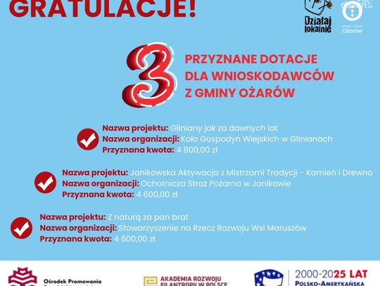 Trzy projekty zgłoszone do tegorocznej edycji konkursu "Działaj Lokalnie" organizowanego przez Ośrodek Promowania Przedsiębiorczości w Sandomierzu z terenu gminy Ożarów uzyskały dofinansowanie.