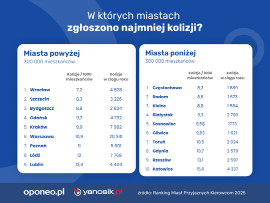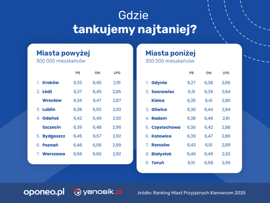 Na korzyść miasta przemawiają również konkurencyjne ceny paliw – zwłaszcza LPG, które w Kielcach kosztuje średnio 2,80 zł – najtaniej wśród wszystkich analizowanych miast. W rankingu pozytywnie oceniono także względnie niską liczbę kolizji drogowych: zaledwie 1 584 w ciągu roku, co daje 8,8 kolizji na 1000 mieszkańców.