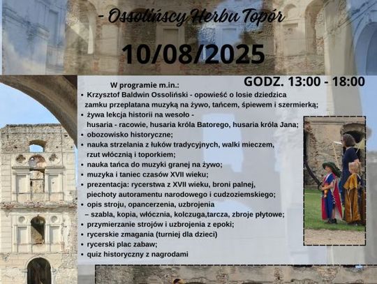 Nie zabraknie też opowieści o losach Krzysztofa Baldwina Ossolińskiego okraszonego muzyką i tańcem. Będzie też rycerski plac zabaw z turniejem dla dzieci i rywalizacją w quizie historycznym między drużynami.