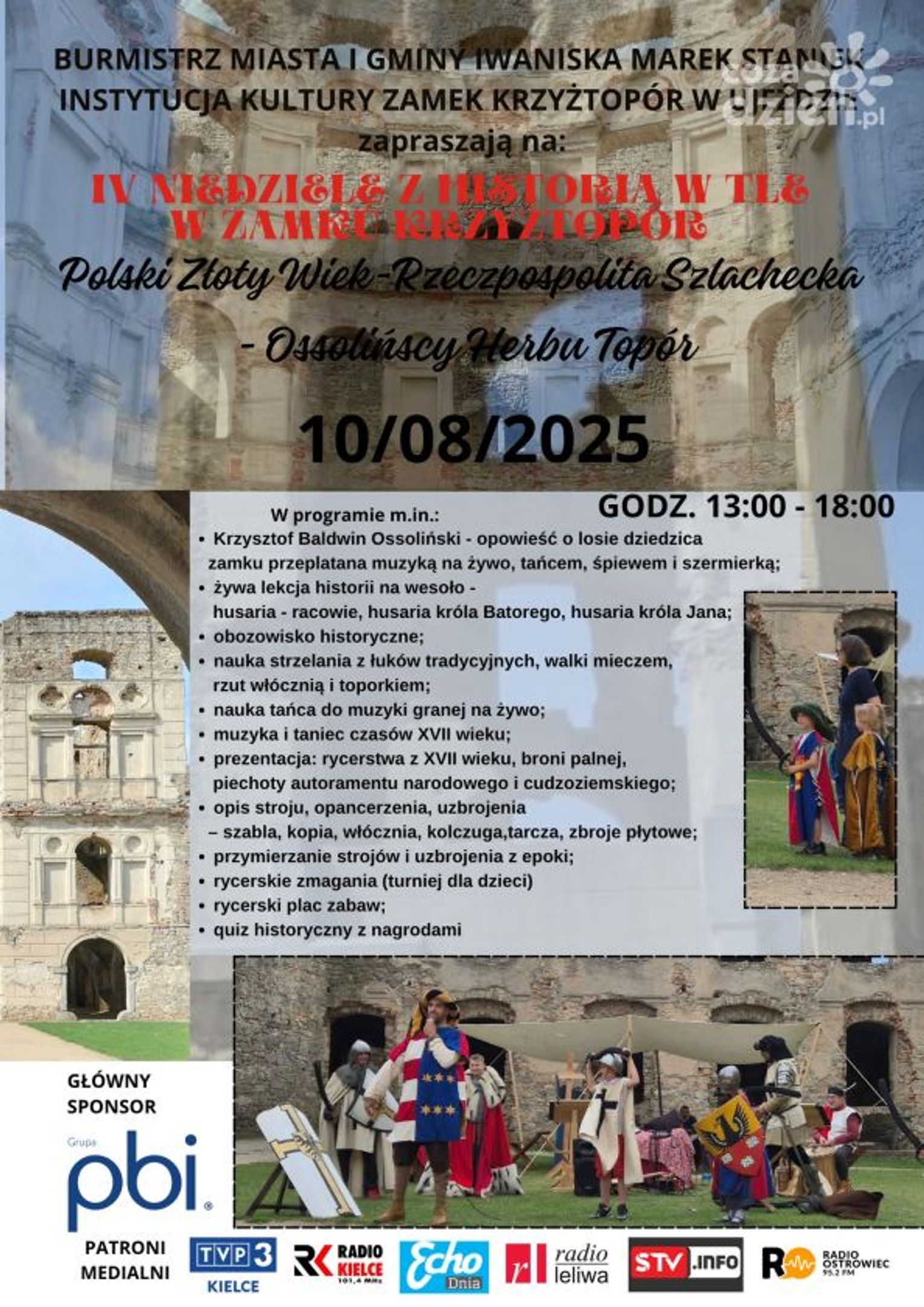 Na IV niedzielę z historią w tle zapraszamy do zamku Krzyżtopór w Ujeździe w niedzielę, 10 sierpnia. W programie wydarzenia, które będzie odbywało się między godz. 13 a 18 w zabytkowych ruinach dawnej posiadłości Krzysztofa Baldwina Ossolińskiego przewidziano przedstawienie wydarzeń jakie mogły mieć miejsce w czasie Polskiego Złotego Wieku tzw. Rzeczpospolitej Szlacheckiej.