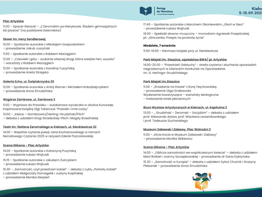 Festiwal, którego program rozciąga się na ponad tydzień, oferuje dziesiątki wydarzeń: od spotkań autorskich, debat literackich, warsztatów, po spacery tematyczne i spektakle. Udział wezmą m.in. Katarzyna Puzyńska, Grażyna Plebanek, Michał Rusinek, Jakub Żulczyk, Joanna Bator, Sylwia Chutnik, Anita Werner, Robb Maciąg i wielu innych autorów i artystów.