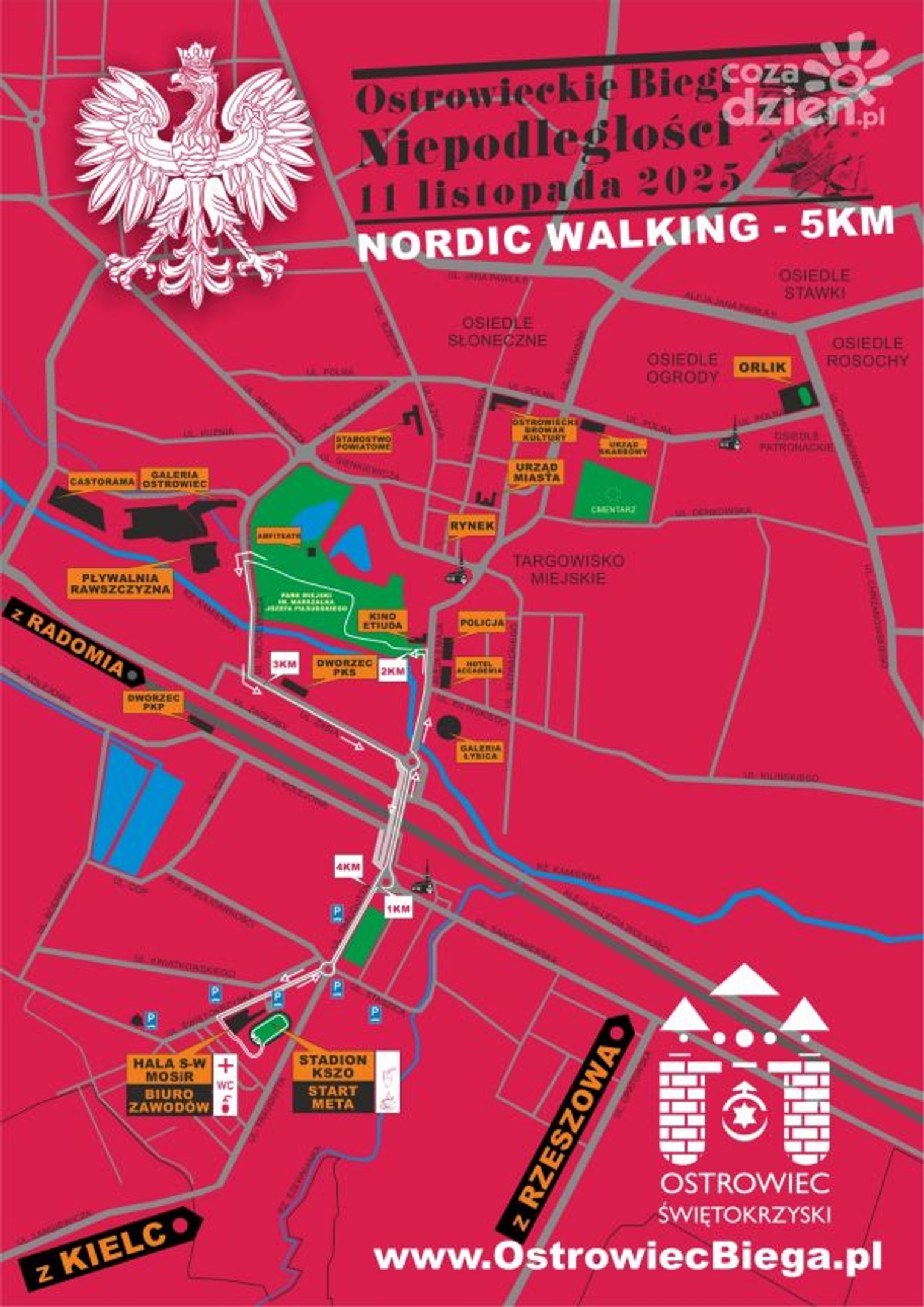 Bieg główny na dystansie 10km oraz marsz na 5km ruszą z Miejskiego Stadionu Sportowego KSZO punktualnie o godzinie 13 w dniu 11 listopada 2025. Na stronie www.OstrowiecBiega.pl uruchomione zostały zapisy online i na listach startowych jest już ponad stu chętnych. Opłata startowa obowiązująca do końca września wynosi 40zł, później będzie rosła. Limit uczestników ustalony został na 500 osób (400 w biegu i 100 w marszu). Tradycyjnie na najlepszych biegaczy czekać będą cenne nagrody. Pula nagród finansowych już w tej chwili wynosi 12900zł. Na najlepsze trójki w kategorii open (mężczyzn i kobiet) czekać będą czeki w wysokości 1000, 800 i 600zł, natomiast podium w kategoriach wiekowych „wycenione” zostało na odpowiednio 400, 300 i 200zł. Organizator zastrzega sobie możliwość ufundowania i wręczania innych dodatkowych nagród i wyróżnień. Tradycyjnie na nagrody mogą liczyć miejscowi biegacze, dla których stworzona zostanie specjalna klasyfikacja. Opłata startowa za udział w biegu i marszu musi być wniesiona w terminie obowiązywania stawki (decyduje data zaksięgowania na rachunku Organizatora) - do dnia 30 września 2025r. - 40zł, do dnia 6 listopada 2025r. - 60 zł, w dniu imprezy - 100zł. W ramach opłaty każdy z uczestników otrzyma specjalny pakiet startowy, w którym znajdzie się m.in. pamiątkowa koszulka, na mecie medal oraz poczęstunek i wstęp do strefy regeneracji po biegu. Dolna granica wieku dla uczestników biegu głównego (10km) wynosi – 15 lat (rocznik 2010 i starsi). W marszu Nordic Walking nie obowiązują limity wiekowe, ale urodzeni przed 2010 rokiem mogą wziąć udział w marszu wyłącznie pod opieką osoby dorosłej. Bieg zostanie przeprowadzony na trasie wytyczonej na ulicach Ostrowca Świętokrzyskiego, ze startem i metą na Miejskim Stadionie Sportowym „KSZO” w Ostrowcu Świętokrzyskim (ul. Świętokrzyska 11). Uczestnicy Ostrowieckich Biegów Niepodległości 2025 przebiegną ulicami Świętokrzyską, Traugutta, Aleja 3 Maja, Denkowską, Chrzanowskiego, Polną, Iłżecką, Starokunowską, Sienkiewicza, Mickiewicza, Żabią i wrócą na stadion KSZO. O bezpieczeństwo uczestników zadbają funkcjonariusze Wydziału Ruchu Drogowego Komendy Powiatowej Policji w Ostrowcu Świętokrzyskim, Straży Miejskiej oraz służby ochrony i wolontariusze.