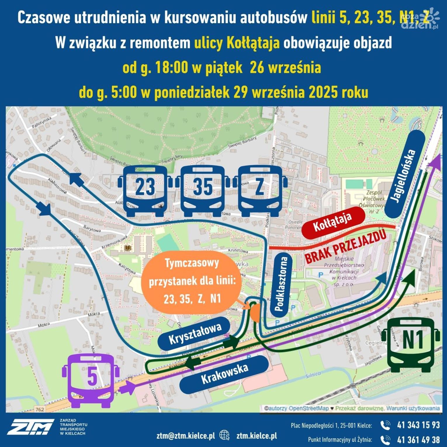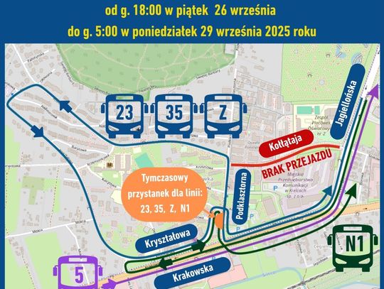W związku z robotami drogowymi, Zarząd Transportu Miejskiego zapowiedział czasowe zmiany tras autobusów linii: 5, 23, 35, Z oraz N1. Zmiany obowiązują od piątku, 26 września od godziny 18:00 do poniedziałku, 29 września do godziny 5:00.