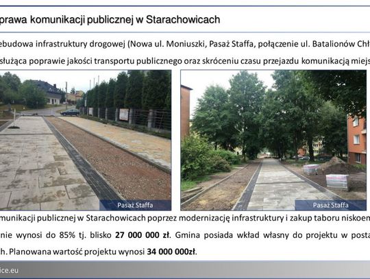 - Budowa Centrum Komunikacyjnego Starachowice Wschodnie (budowa parkingu dla rowerów, przebudowa stanowisk dla autobusów i busów, montaż elektronicznych tablic informacji pasażerskiej, montaż małej architektury, modernizacja oświetlenia).