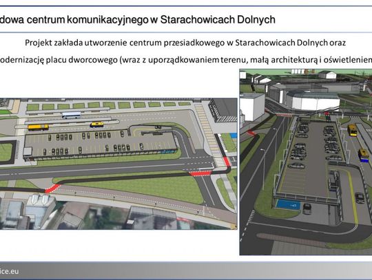 - Budowa Centrum Komunikacyjnego Starachowice Dolne (budowa parkingu poziomowego z pomieszczeniami usługowymi, budowa parkingu dla rowerów, budowa kładki łączącej centrum przesiadkowe z rewitalizowaną częścią miasta przy Zbiorniku Pasternik, przebudowa placu dworcowego oraz stanowisk dla autobusów i busów, montaż elektronicznych tablic informacji pasażerskiej, uporządkowanie terenu, montaż małej architektury, modernizacja oświetlenia).