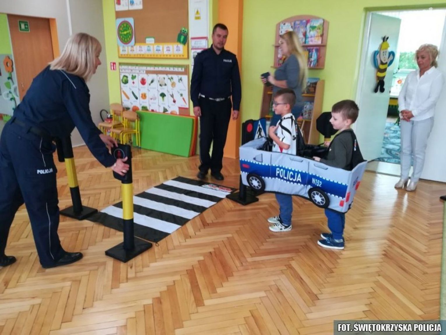 W czasie spotkania mundurowych, dzieci dowiedziały się jak należy poruszać się po drodze i jak bezpiecznie przechodzić przez przejścia dla pieszych. Dzięki mobilnemu Miasteczku Ruchu Drogowego przedszkolaki wzięły udział w zabawie, która uczy samodzielnego i bezpiecznego uczestnictwa w ruchu drogowym. W trakcie nauki mundurowi zaprezentowali i omówili podstawowe znaki drogowe oraz działania sygnalizatorów świetlnych. Dużym zainteresowaniem wśród najmłodszych cieszyły się auto samochodziki. Przedszkolaki chętnie wzięły udział w zabawie "Ruch uliczny" - kilkoro dzieci naśladowało samochody, pozostali wcieli się w przechodniów i policjanta, kierującego ruchem. Na koniec spotkania, w podziękowaniu dla stróżów prawa milusińscy zaśpiewali piosenkę nawiązującą do zawodu policjanta oraz zaprezentowali swoje prace plastyczne.