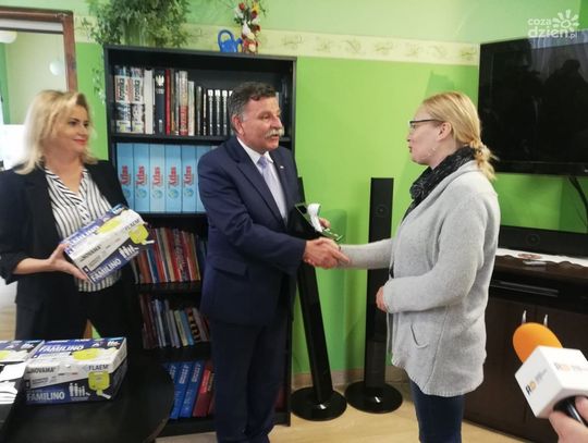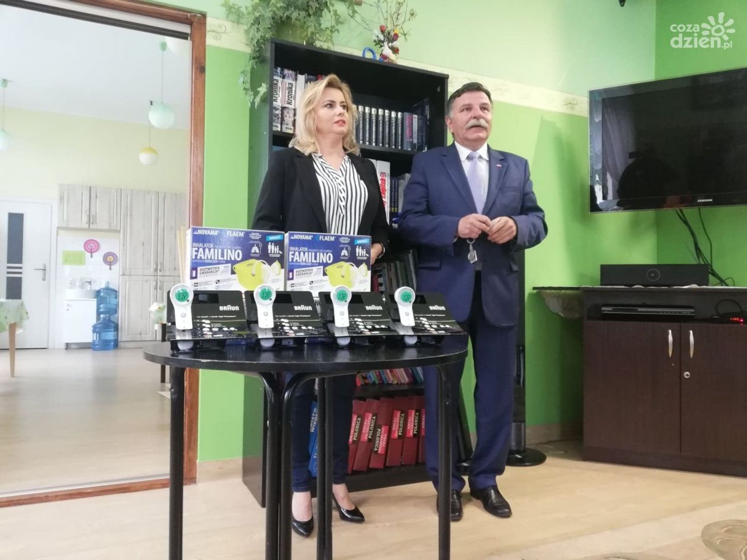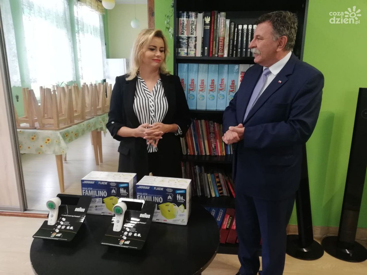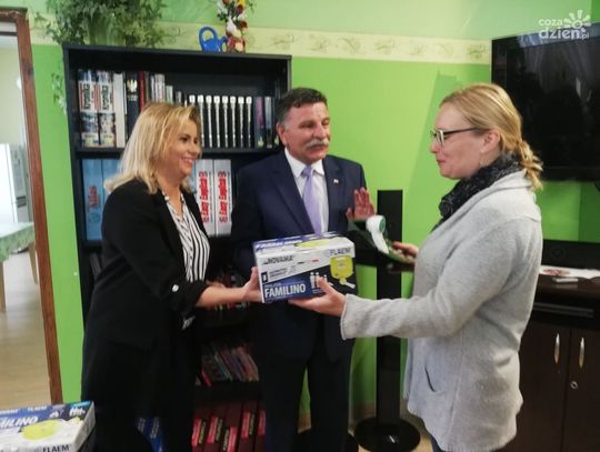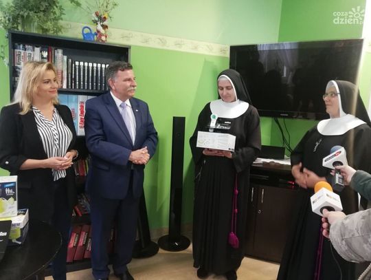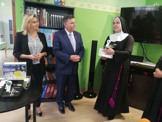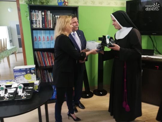 Termometry i inhalatory oficjalnie odebrały siostry z "Naszego Domu" i przedstawicielka placówki w Małachowie.