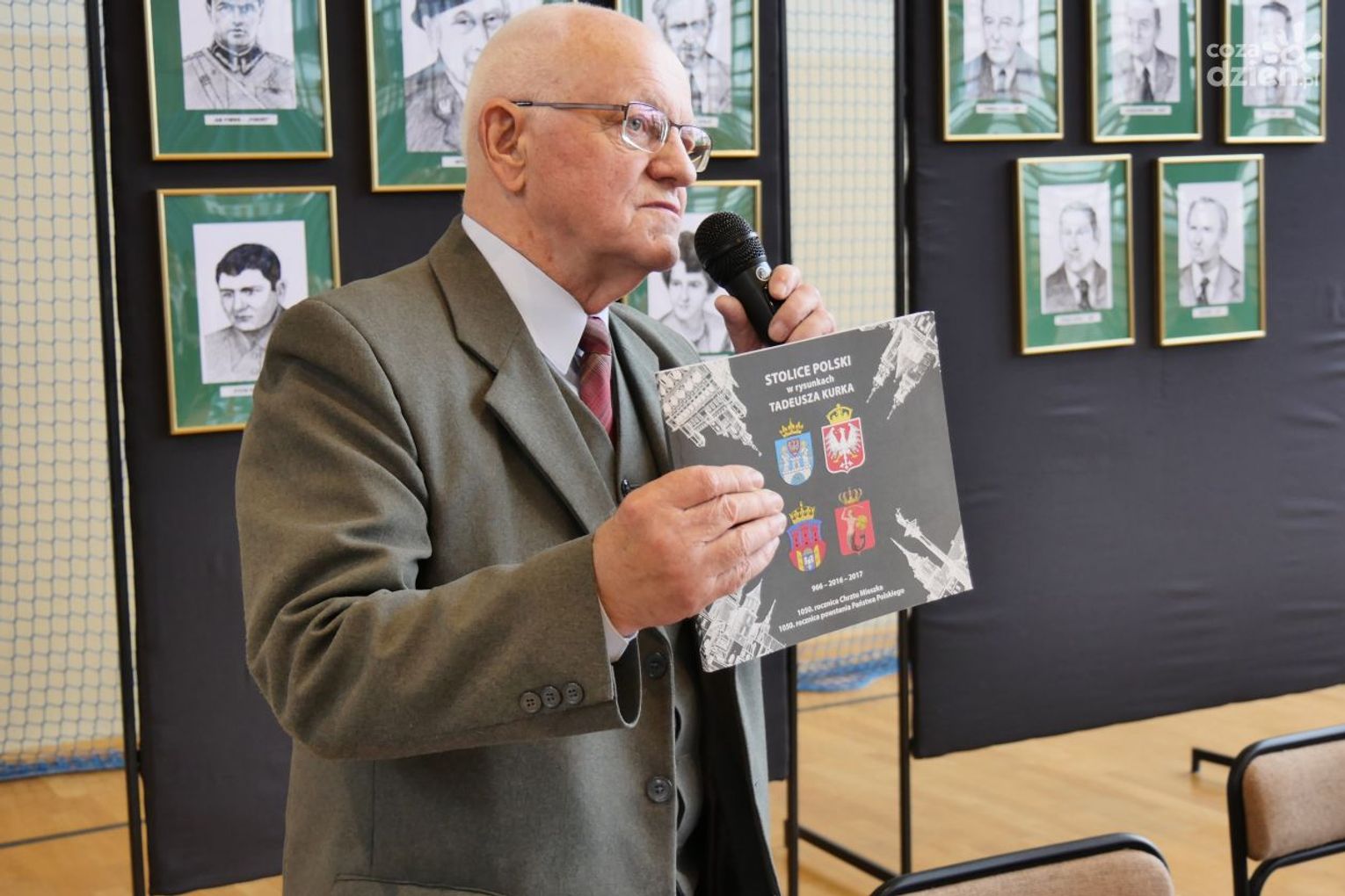 Tadeusz Kurek w kunowskiej podstawówce pojawił się na zaproszenie dyrekcji szkoły: Doroty Opary i Małgorzaty Kowalskiej. Spotkanie dotyczyło głównie twórczości artysty plastyka, który zaprezentował zgromadzonym - uczniom, nauczycielom z PSP im. Antoniego Hedy "Szarego" oraz zaprzyjaźnionych placówek oświatowych swój bogaty dorobek artystyczny - albumy i grafiki, malarstwo na porcelanie, a także wystawę poświęconą żołnierzom Armii Krajowej. Część prac z tego cyklu, wyobrażających partyzantów Ziemi Kunowskiej na czele z wizerunkiem patrona szkoły T. Kurek przekazał na rzecz placówki. Będą one wyeksponowane w mini galerii - czwartej już tego typu w powiecie. Podobne są w ostrowieckim Liceum Ogólnokształcącym im. Joachima Chreptowicza w Ostrowcu Św., szkołach w Mominie i Waśniowie. Kolejne portrety mają trafić do muzeum we Wronowie.