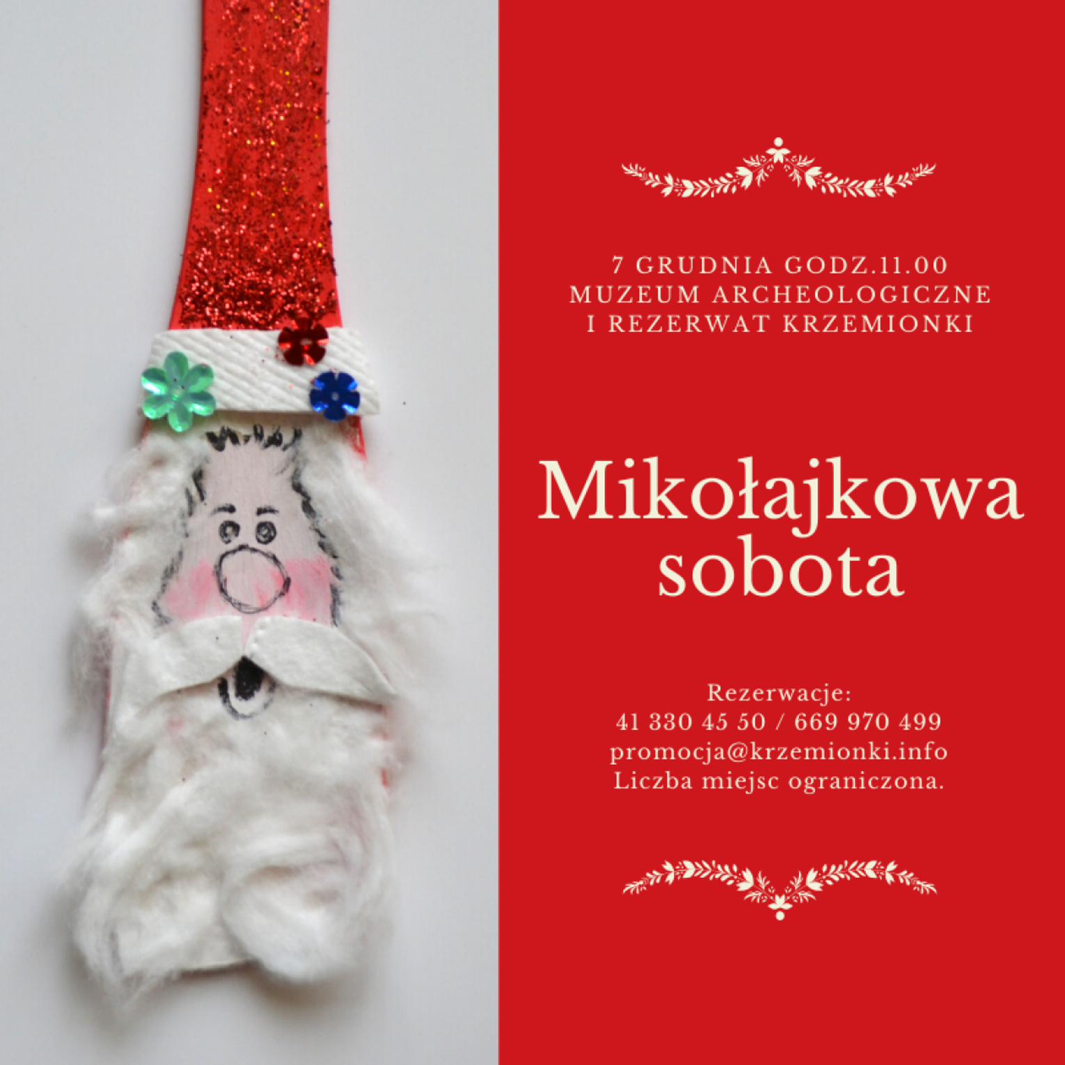 Podczas zajęć, które rozpoczną się o godz. 11 (7 grudnia) uczestnicy poznają prawdziwą historię popularnego świętego i wspólnie poszukają sposobów na pomaganie mu w licznych obowiązkach, stworzą również niecodzienne "mikołaje" z drewnianych łopatek. Będą też drobne podarunki.