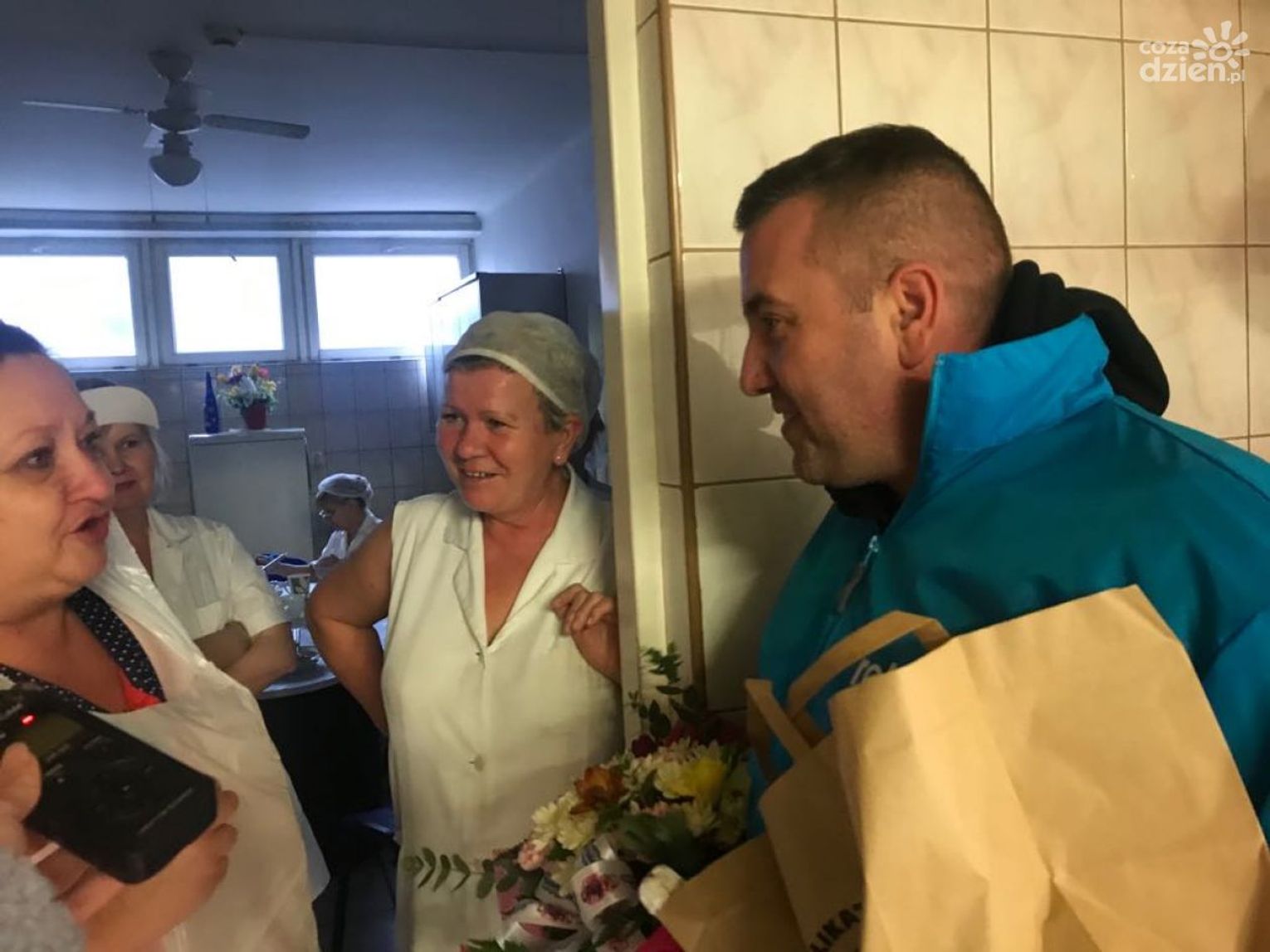 Pani Ewa gotując pyszności w pracy niczego się nie spodziewała. Ciężko było jej też domyśleć się, kto sprawił jej niespodziankę w dniu urodzin, po kilku próbach w końcu się udało... to była "sprawka" brata. Piątek 13-go dla pani Ewy okazał się bardzo szczęśliwy. O prezenty zadbali niezawodni sponsorzy: Kwiaciarnia MAJA, Delikatesy u Dzika, Piekarnia i Cukiernia Skalski oraz Glass and Graphics.