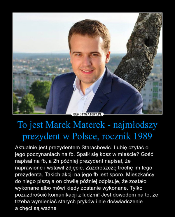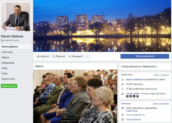 Prezydent Marek Materek jest bardzo znaną postacią nie tylko w swoim mieście, ale i w mediach społecznościowych, które czuje i skutecznie dla miasta, i siebie wykorzystuje – co widać na każdym kroku. Materek jest bardzo aktywny min. na Facebooku, gdzie starachowiczanie mogą bezpośrednio się z nim skontaktować . Podkreślę – bezpośrednio. Piszą do niego i przeważnie dostają odpowiedź nie od delegowanego urzędnika, lecz od samego szefa miasta. Często odpowiedź zawiera konkretne rozwiązania ich problemu. „Była dziura w ulicy? Dziękuję za informację. Poleciłem załatać dziurę. Nie ma dziury. Przepraszam, że czekał pan 2 dni na odpowiedź i likwidację tego kłopotu”. Tak w skrócie można opisać to, co często dzieje się w odległych o 40 km od Radomia Starachowicach. Nawet słynne Demotywatory piętnujące w internecie wszystko działania prezydenta opisały tak: