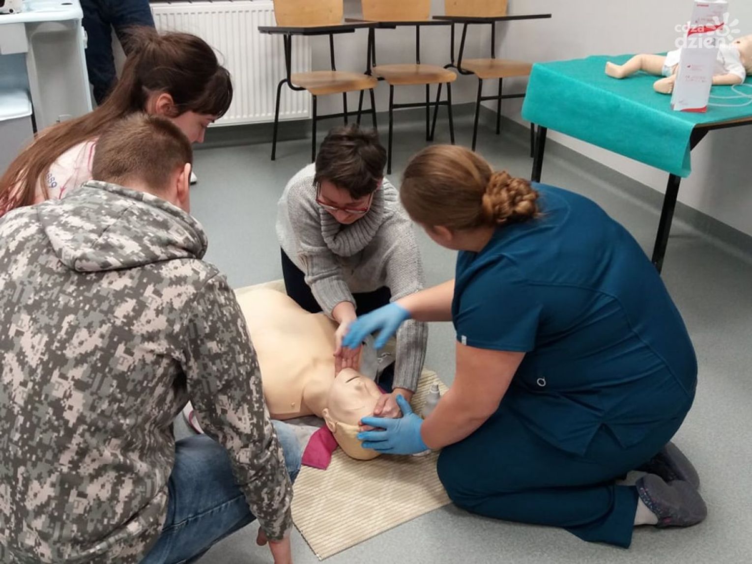 W drugiej części wizyty odbyły się warsztaty z zakresu pierwszej pomocy przedmedycznej przeprowadzone przez dr Monikę Borek i pielęgniarkę Olę Guzik. Celem warsztatów było oswojenie młodzieży z ideą pomagania oraz nabycie przez uczniów praktycznych umiejętności na temat tego, jak należy zachować się w sytuacjach zagrożenia życia i zdrowia. Uczniowie mieli możliwość przeprowadzenia resuscytacji krążeniowo- oddechowej z użyciem fantomów i przećwiczenia dokładnej sekwencji postępowania.
