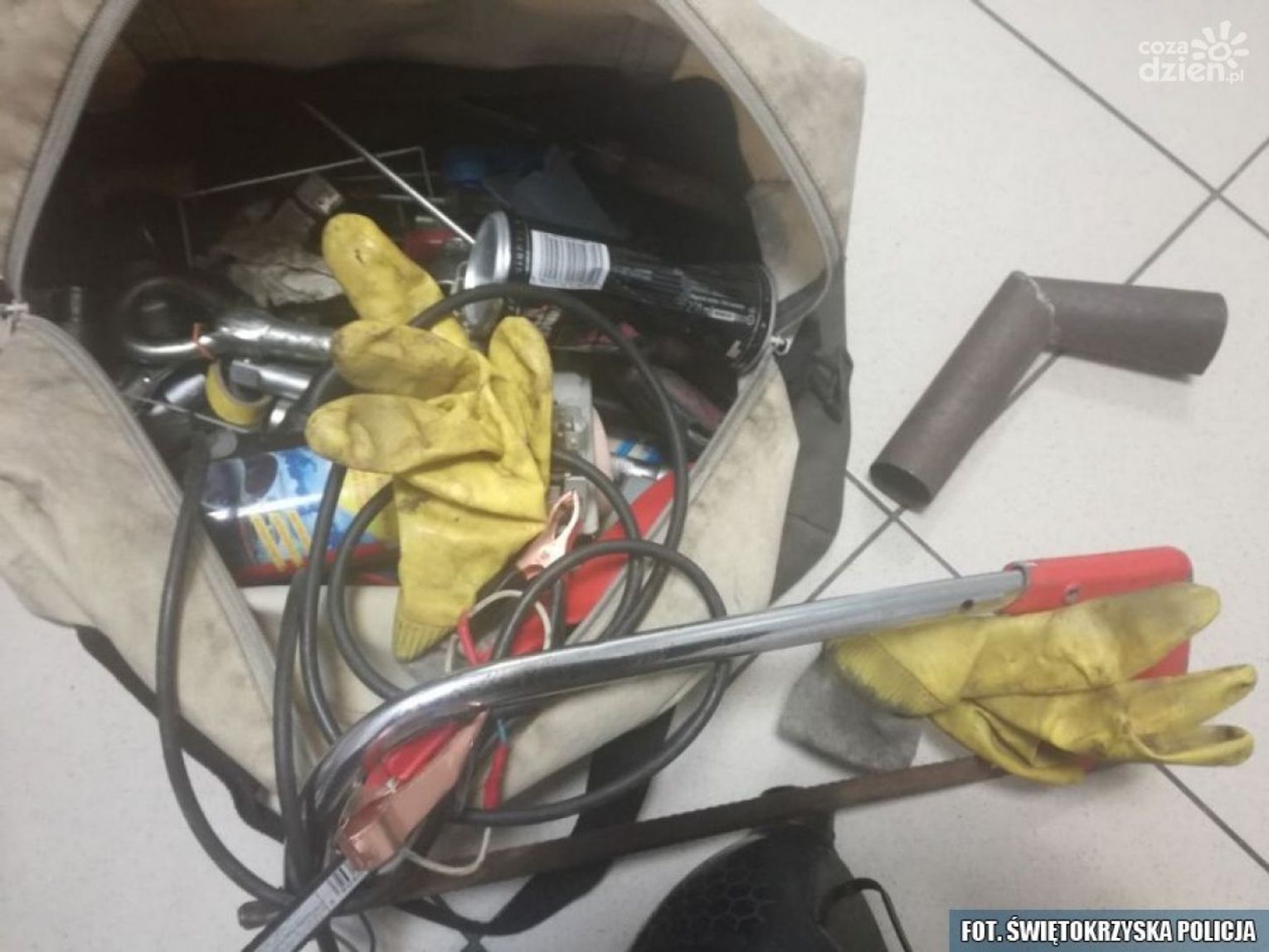 W piątkową noc dyżurny opatowskiej komendy otrzymał zgłoszenie, z którego wynikało, że „zakapturzony” mężczyzna ciężkim przedmiotem przypominającym siekierę próbuje rozbić skrzynkę wrzutową na pieniądze w myjni samochodowej w miejscowości Iwaniska. Informujący o zdarzeniu przekazał policjantowi, iż mężczyzna ten został spłoszony i uciekł pieszo w jedną z bocznych dróg. Mundurowi na polu zauważyli zaparkowany pojazd. W środku znajdowały się cztery osoby. Dwaj mężczyźni w wieku 37 i 33-lata oraz kobiet w wieku 43 i 42-lata. Cała czwórka z powiatu ostrowieckiego. Osoby te nie potrafiły logicznie wytłumaczyć co robią w tym miejscu. Policjanci we wnętrzu auta znaleźli m.in. brzeszczoty, duży młotek, śrubokręty czy pusty kanister. Jak się okazało jeden z mężczyzn odpowiadał rysopisowi osoby, która próbowała dokonać kradzieży pieniędzy z myjni samoobsługowej. Cała czwórka trafiła do policyjnego aresztu. Jak się okazało po sprawdzeniu w policyjnych bazach danych wszyscy mieli już uprzednio konflikt z prawem.