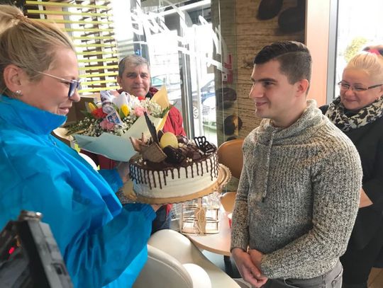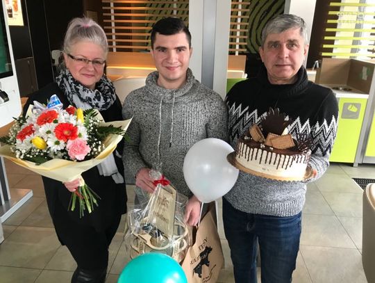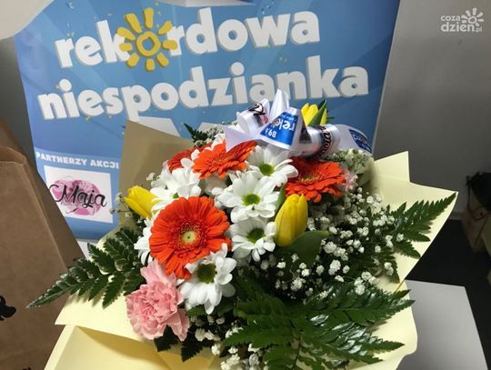 Tym razem to mama zgłosiła swojego syna jubilata do Rekordowej Niespodzianki. Maciek swoje 24 urodziny zapamięta na długo. Kiedy odwiedziliśmy go z mocą prezentów nie krył zaskoczenia i wzruszenia, podobnie jak jego ukochani rodzice. Prezenty zapewnili niezawodni sponsorzy akcji: Kwiaciarnia MAJA, Delikatesy u Dzika, Piekarnia i Cukiernia Skalski oraz Glass and Graphics.