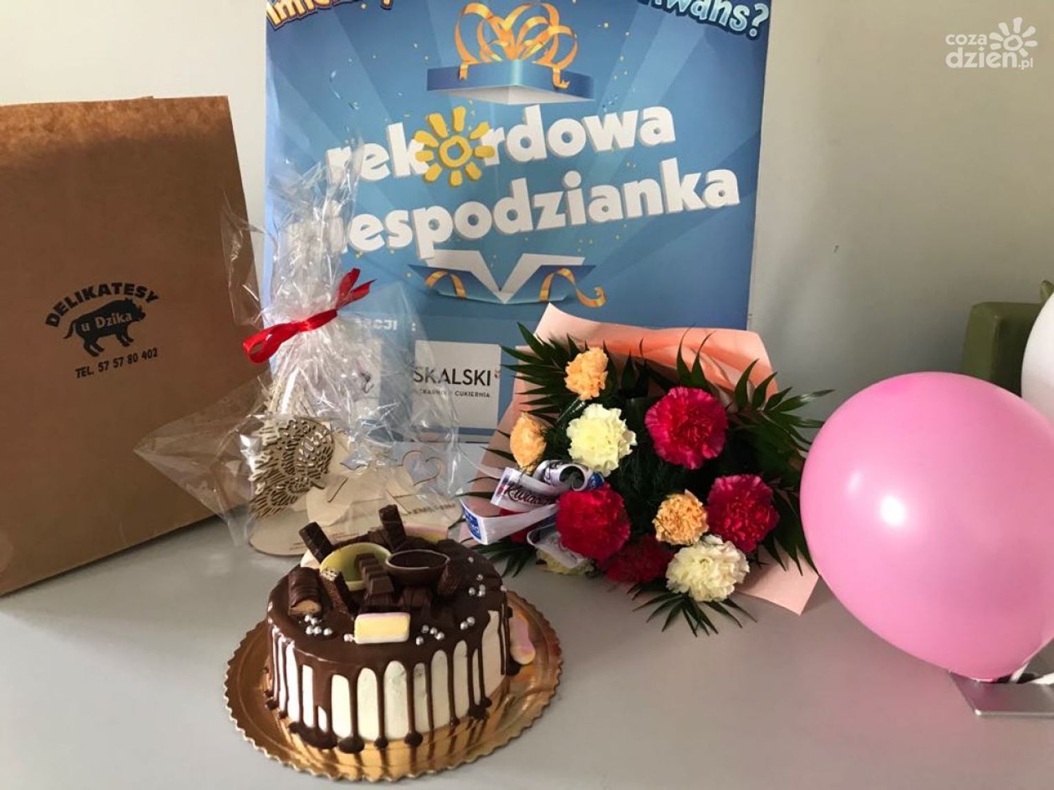 Pani Aneta miała aż dwa powody do świętowania. Urodziny i rozpoczęcie nowej pracy. Do Rekordowej Niespodzianki zgłosili ją jej cudowni przyjaciele. O prezenty zadbali sponsorzy akcji: Kwiaciarnia MAJA, Delikatesy u Dzika, Piekarnia i Cukiernia Skalski oraz Glass and Graphics.