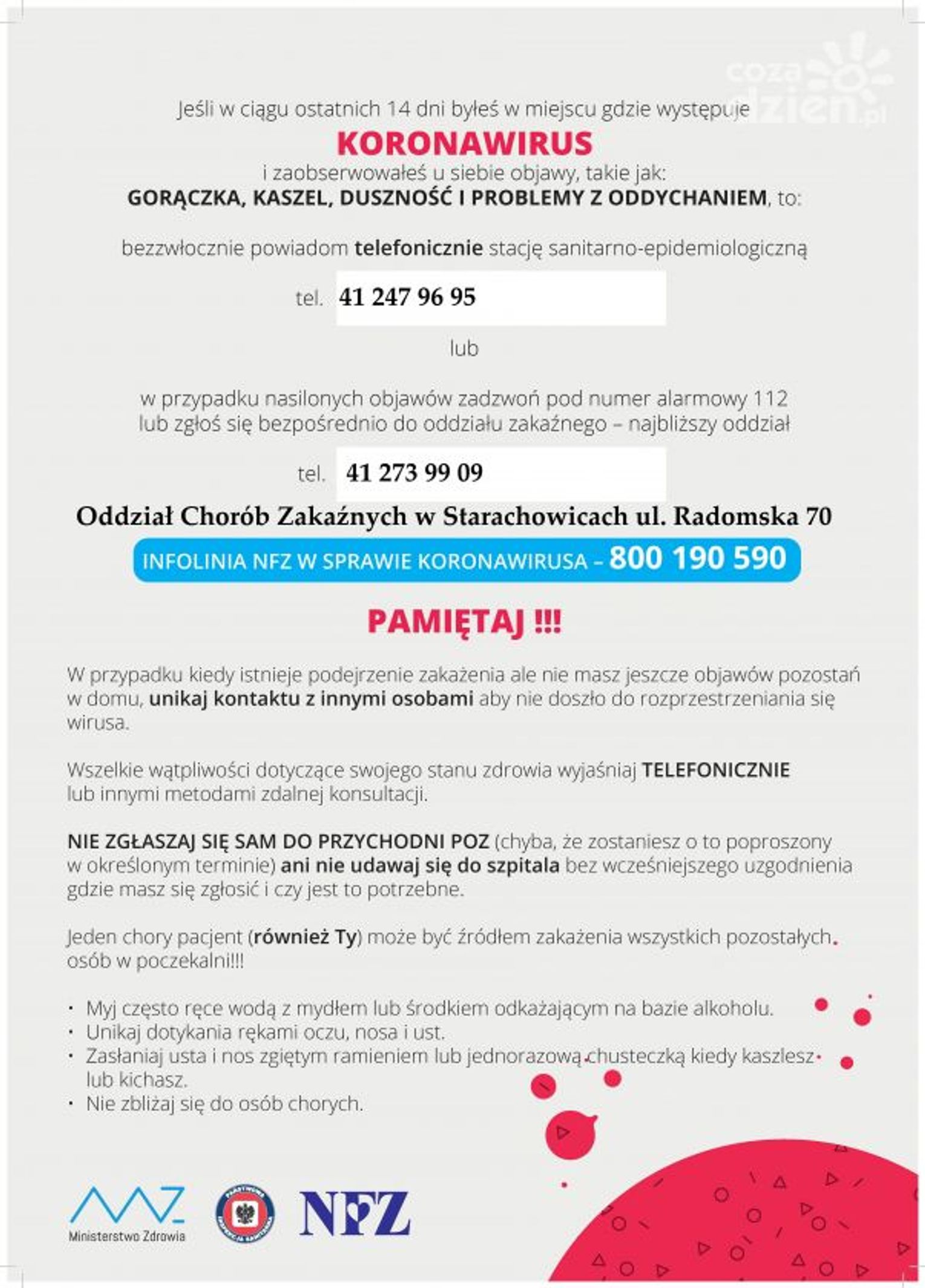 Wczoraj (poniedziałek, 2 marca) odbyło się spotkanie prezydenta, premiera oraz ministrów dotyczące aktualnej sytuacji bezpieczeństwa, związanej z koronawirusem. Po zakończeniu rozmów w Biurze Bezpieczeństwa Narodowego, Andrzej Duda poinformował, że dotąd nie stwierdzono w Polsce obecności koronawirusa i zaapelował o spokój. Niemniej Państwowy Powiatowy Inspektor Sanitarny w Ostrowcu Św. mając na uwadze ochronę zdrowia publicznego oraz w trosce o zdrowie mieszkańców powiatu ostrowieckiego instruuje, jak można zapobiec zakażeniu wirusem.