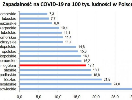 Jak podaje Ministerstwo Zdrowia zapadalność w Polsce na Covid-19 na 100 tys. wynosi 17,4. Najwyższe wskaźniki odnotowuje się w województwie mazowieckim - 30,7; dolnośląskie - 24,0; łódzkie - 21,5.