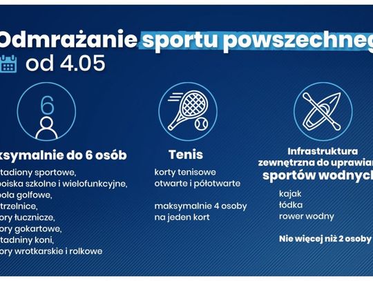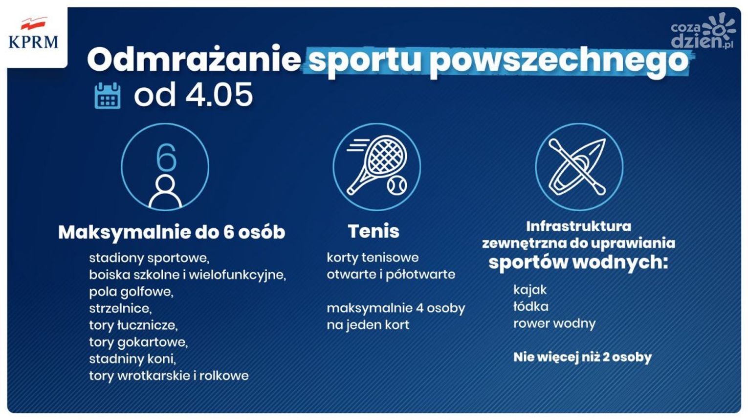 Z boisk i stadionów w jednym czasie będzie mogło korzystać maksymalnie do sześciu osób, natomiast z kortów tenisowych maksymalnie cztery osoby. Można będzie korzystać również z infrastruktury do uprawiania sportów wodnych, takich jak kajaki, łódki czy rowery wodne, ale z ograniczeniem do dwóch osób.