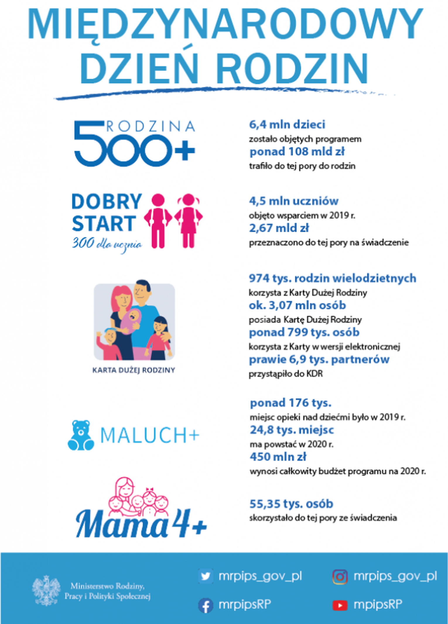 W marcu 2020 r. świadczenie wychowawcze przysługiwało na 6,4 mln dzieci. W czerwcu 2019 r., czyli przed rozszerzeniem programu, uprawnionych do świadczenia wychowawczego było 3,6 mln dzieci w 2,4 mln rodzin. Od początku działania programu "Rodzina 500+" do rodzin trafiło 108 mld zł. Na realizację programu "Rodzina 500+" w 2020 r. zabezpieczono w budżecie państwa kwotę 39,2 mld zł.