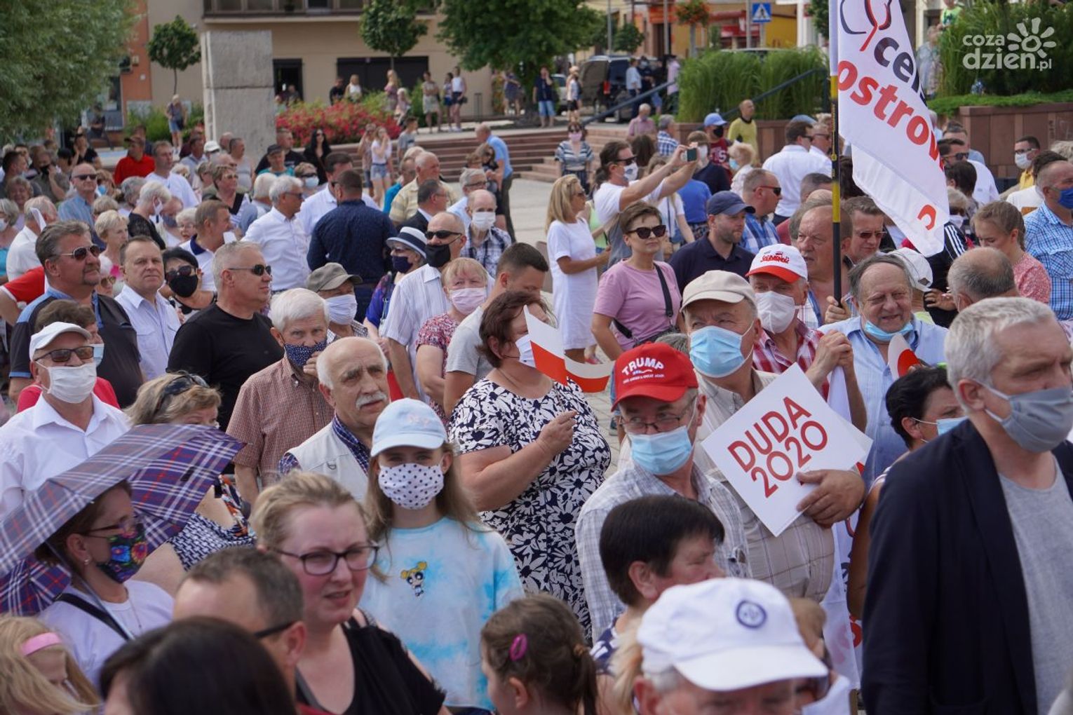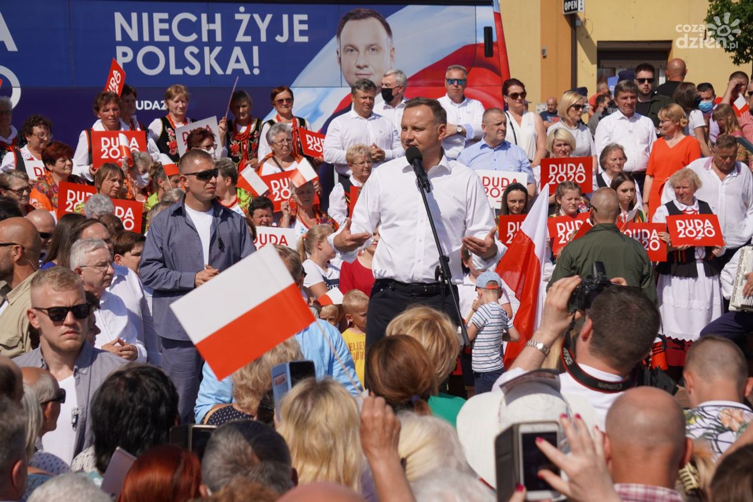 Andrzej Duda mówił też o polityce rządu w obliczu epidemii koronawirusa i o tym, że Polska dobrze poradziła sobie z zapewnieniem opieki medycznej. Zwrócił uwagę także na sprawy komunikacji. Ponadto zachęcał zgromadzonych do kupowania polskich produktów, które oznaczone są kodem kreskowym 590.