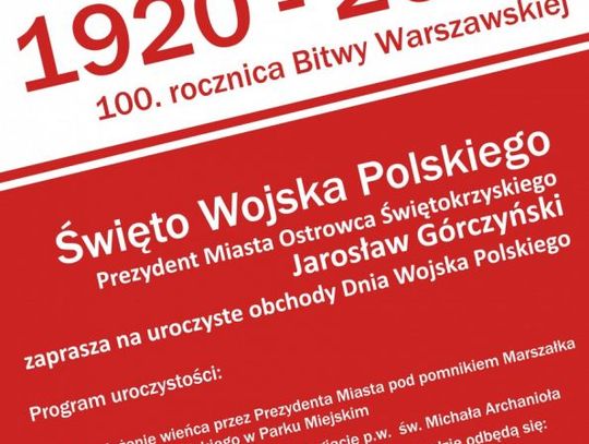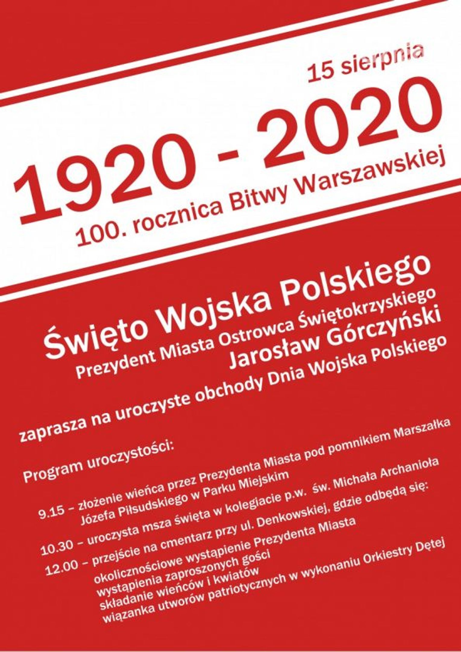 Prezydent Ostrowca Świętokrzyskiego Jarosław Górczyński zaprasza na obchody 100-tnej rocznicy Bitwy Warszawskiej, które odbędą się w sobotę 15 sierpnia. Rozpoczną się o godzinie 9.15 złożeniem wiązanki przy pomniku Józefa Piłsudskiego w Parku Miejskim. Następnie o godzinie 10.30 w kolegiacie św. Michała archanioła zostanie odprawiona uroczysta msza św. Tuż po niej nastąpi przemarsz na cmentarz przy ul. Denkowskiej, gdzie przed pomnikiem poległych uczniów z gimnazjum im. J. Chreptowicza zostaną złożone wiązanki.