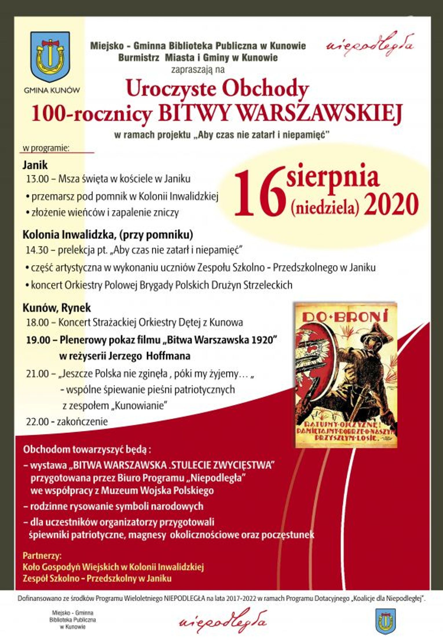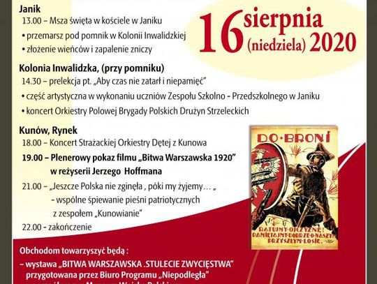 Natomiast w niedzielę 16 sierpnia obchody 100-tnej rocznicy Bitwy Warszawskiej będą odbywały się w gminie Kunów. Rozpocznie je uroczysta msza św. o godzinie 13.00 w kościele w Janiku. Następnie w Kolonii Inwalidzkiej przy pomniku o godzinie 14.30 odbędzie się prelekcja zatytułowana " Aby czas nie zatarł i niepamięć". Wystąpią również uczniowie Zespołu Szkolno-Przedszkolnego w Janiku. Okolicznościowy koncert da Orkiestra Polowa Brygady Polskich Drużyn Strzeleckich. Dalsza część uroczystości przeniesie się ponownie do Janika, gdzie na tamtejszym rynku o godzinie 18.00 odbędzie się koncert Strażackiej Orkiestry Dętej z Kunowa zaś na godzinę 19.00 zaplanowano plenerowy pokaz filmu "Bitwa Warszawska 1920" w reżyserii Jerzego Hoffmana. Uroczystości w gminie Kunów podsumuje wspólne śpiewanie pieśni patriotycznych zatytułowane "Jeszcze Polska nie zginęła póki my żyjemy" z zespołem Kunowianie. Na obchody 100-tnej rocznicy Bitwy Warszawskiej w gminie Kunów zaprasza burmistrz Lech Łodej oraz Miejsko-Gminna Biblioteka w Kunowie.