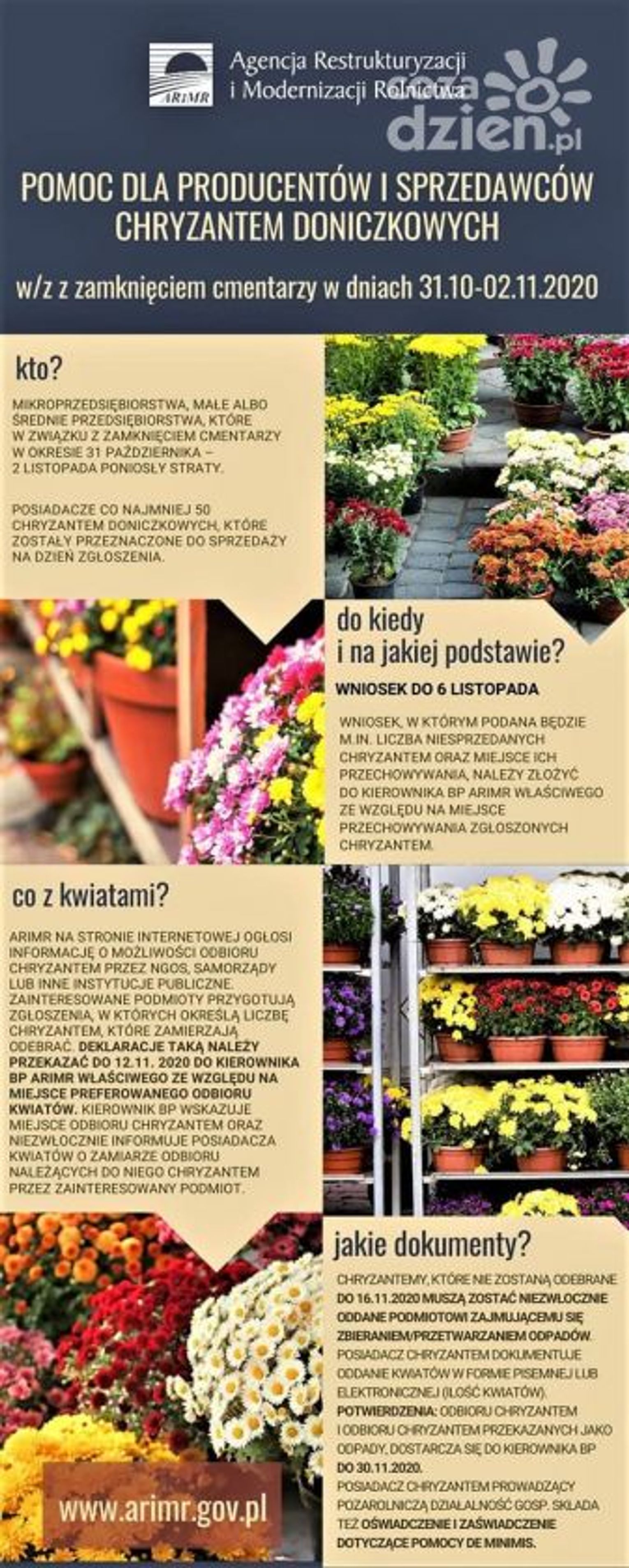 Do 6 listopada producenci i sprzedawcy chryzantem muszą złożyć wniosek o pomoc związaną ze stratami spowodowanymi zamknięciem cmentarzy w okresie od 31 października do 2 listopada 2020 r. O tym kto dokładnie może otrzymać pomoc, na jakiej podstawie będzie ona udzielana, jakie dokumenty trzeba przygotować oraz co stanie się z niesprzedanymi kwiatami? Na antenie Radia Rekord 89,6 FM mówił Józef Cepil - dyrektor Świętokrzyskiego Oddziału Regionalnego ARiMR w Kielcach.