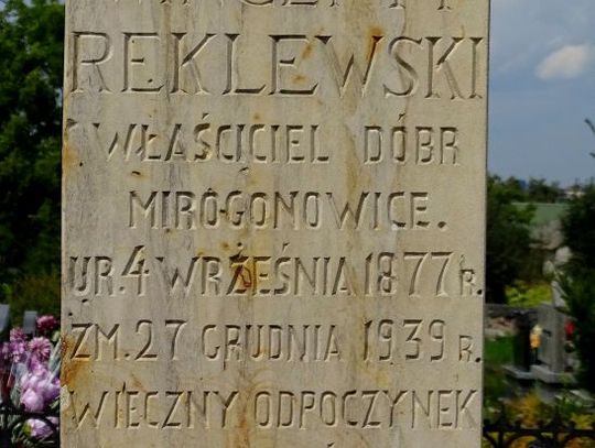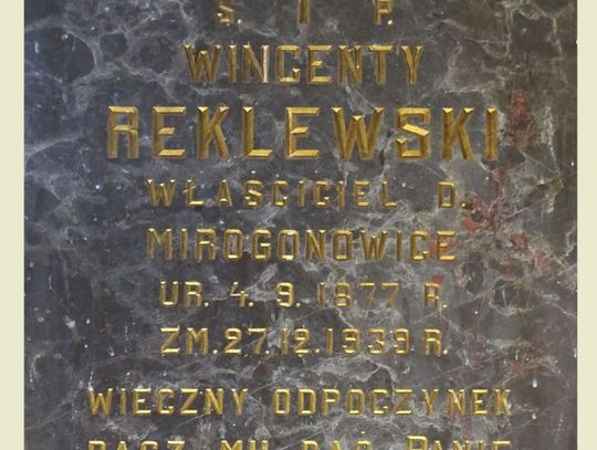 W lipcu 1943 r. ks. Glibowski, na prośbę wdowy Anny Reklewskiej i jej dzieci, zwrócił się do biskupa o wyrażenie zgodę na umieszczenie w kościele waśniowskim marmurowej tablicy ku czci dziedzica, obok innych tablic zmarłych z jego rodziny. W liście dał piękne świadectwo o zmarłym. Napisał: „W okolicy świętokrzyskiej przed wojną obecną najpoważniejszym obywatelem ziemskim był śp. Wincenty Reklewski, zamieszkały w majątku swoim w Mirogonowicach, parafii Waśniów; był to dobry gospodarz, pracowity bardzo, dla ludzi sprawiedliwy, dla biednych uczynny i miłosierny, corocznie sowicie wspomagał klasztory Św. Katarzyny i na Św. Krzyżu. Był przy tym dobrym i praktykującym katolikiem: co niedziela i święto musiał być w kościele na Mszy Św., corocznie kilkakrotnie uczęszczał do spowiedzi, a po każdej spowiedzi przystępował po kilka razy do Komunii Św., w każdy piątek suszył, corocznie w początku adwentu jeździł do Częstochowy do Matki Boskiej, a objeżdżając swoje pola lub jadąc drogą albo koleją, nie wstydził się modlić z książeczki lub na różańcu.