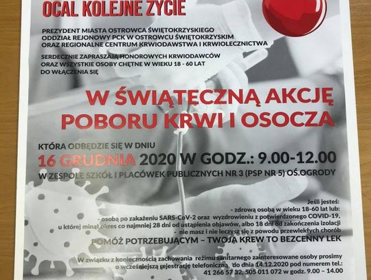I właśnie z myślą o takich osobach postanowiono zorganizować świąteczną akcję zbiórki krwi w ostrowieckiej szkole. W związku z koniecznością zachowania reżimu sanitarnego osoby zainteresowane zbiórką proszone są o wcześniejszą rejestrację telefoniczną, do 14 grudnia, pod numerem telefonu: 41 266 57 32, 505 011 072 w godzinach od 9:00 do 14:00.