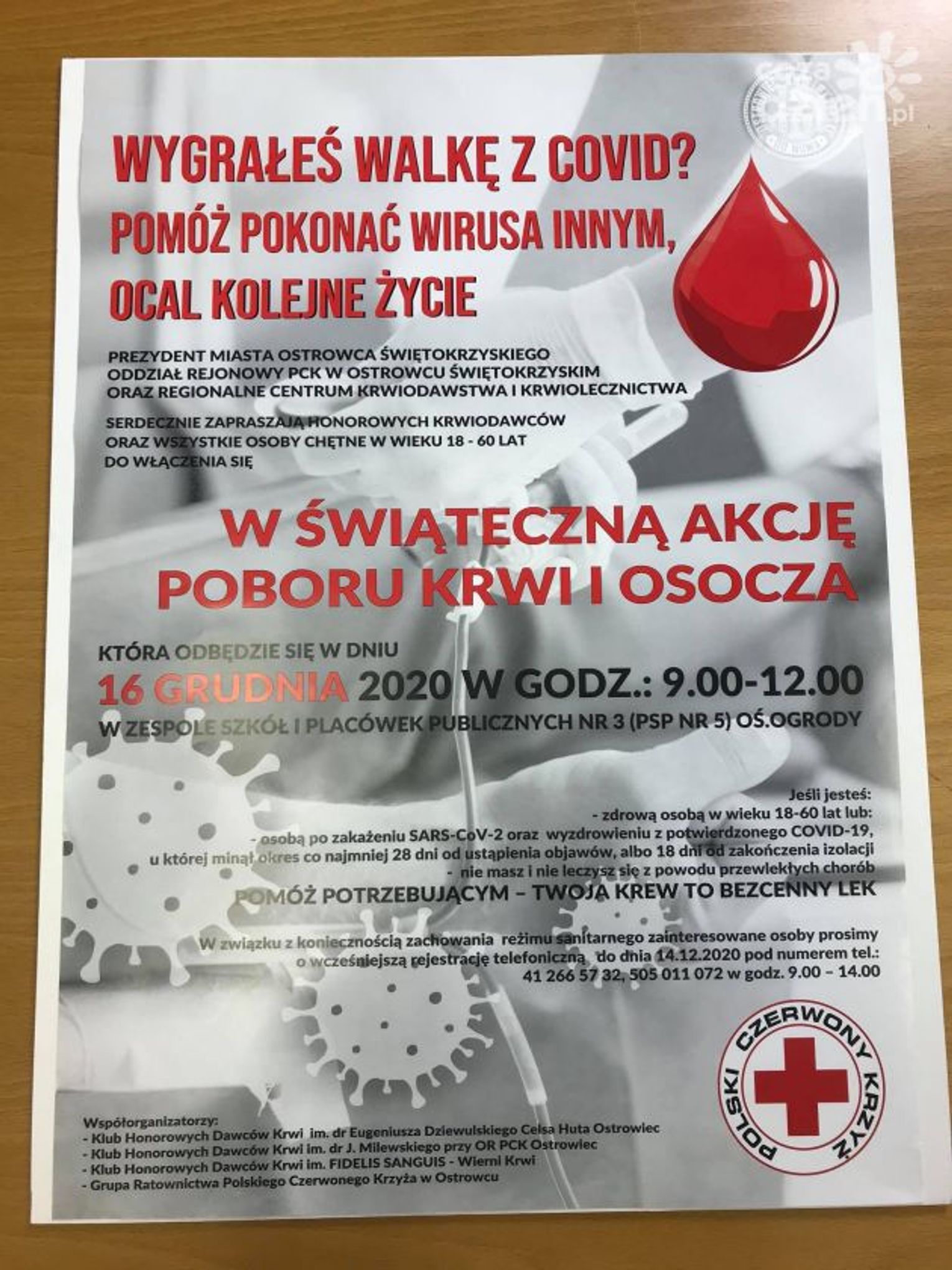 Oprócz oddania krwi - 16 grudnia w naszym mieście, będzie można oddać osocze - to dotyczy osób, które przeszły koronawirusa, są ozdrowieńcami i u których minął okres co najmniej 28 dni od ustąpienia objawów, albo 18 dni od zakończenia izolacji.