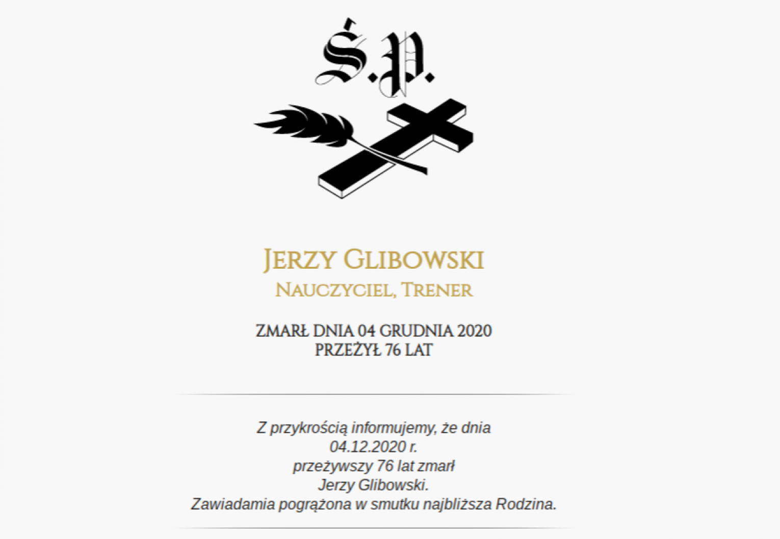 Jerzy Glibowski był trenerem oraz nauczycielem, zmarł w piątek 4 grudnia, w wieku 76 lat. W swojej trenerskiej karierze prowadził min. Star Starachowice, Juvente Starachowice oraz Arkę Pawłów.
