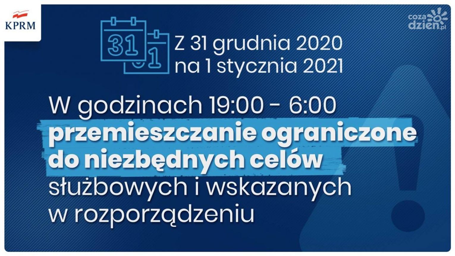 Z 31 grudnia 2020 r. na 1 stycznia 2021 r. w godzinach od 19 do 6 w całym kraju obowiązywać będzie zakaz przemieszczania się. Wyjątkiem będą m.in. niezbędne czynności służbowe, wyjście do sklepu, czy apteki. Tuż po świętach, od poniedziałku 28 grudnia do 17 stycznia 2021 roku w galeriach handlowych pozostaną czynne jedynie sklepy spożywcze, z książkami i prasą, drogerie i apteki. W ograniczonym wymiarze, bo otwarte tylko dla służb mundurowych, medyków, pacjentów szpitali specjalistycznych i ośrodków COS funkcjonować mają hotele (wyjątkiem są hotele robotnicze). Całkowicie zamknięte pozostaną stoki narciarskie, infrastruktura sportowa dostępna ma być tylko w ramach sportu zawodowego, a przyjeżdżający do kraju transportem zorganizowanym muszą liczyć się z 10-dniową kwarantanną. Ponadto przedłużone zostają obowiązujące już obostrzenia w transporcie zbiorowym, podczas nabożeństw, czy gromadzenia się, zakaz wesel, komunii i konsolacji oraz przemieszczania się osób poniżej 16. roku bez opieki rodzica, od poniedziałku do piątku w godz. 8-16. Zamknięte pozostaną siłownie, kluby fitness, aquaparki i restauracje - jedzenie tylko na wynos lub dowóz.