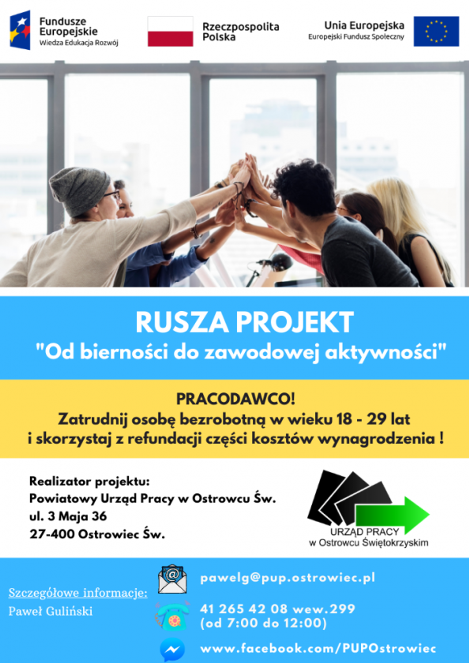 Projekt: „Od bierności do zawodowej aktywności”, skierowany jest do osób w wieku od18 do 29 lat, zarejestrowanych w PUP w Ostrowcu Świętokrzyskim jako osoby bezrobotne.