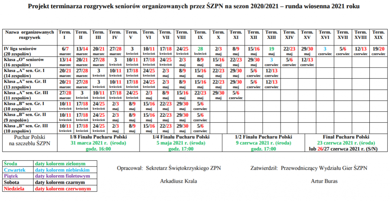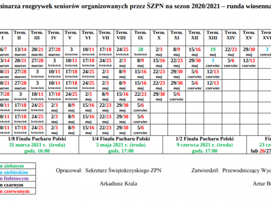 Świętokrzyski Związek Piłki Nożnej ustalił projekt terminarza lig seniorskich na rundę wiosenną sezonu 2020/2021. Najwcześniej, bo już w pierwszy weekend marca planowany jest start IV ligi. Najniższa klasa rozgrywkowa, czyli klasa B wystartuje dopiero w połowie kwietnia.