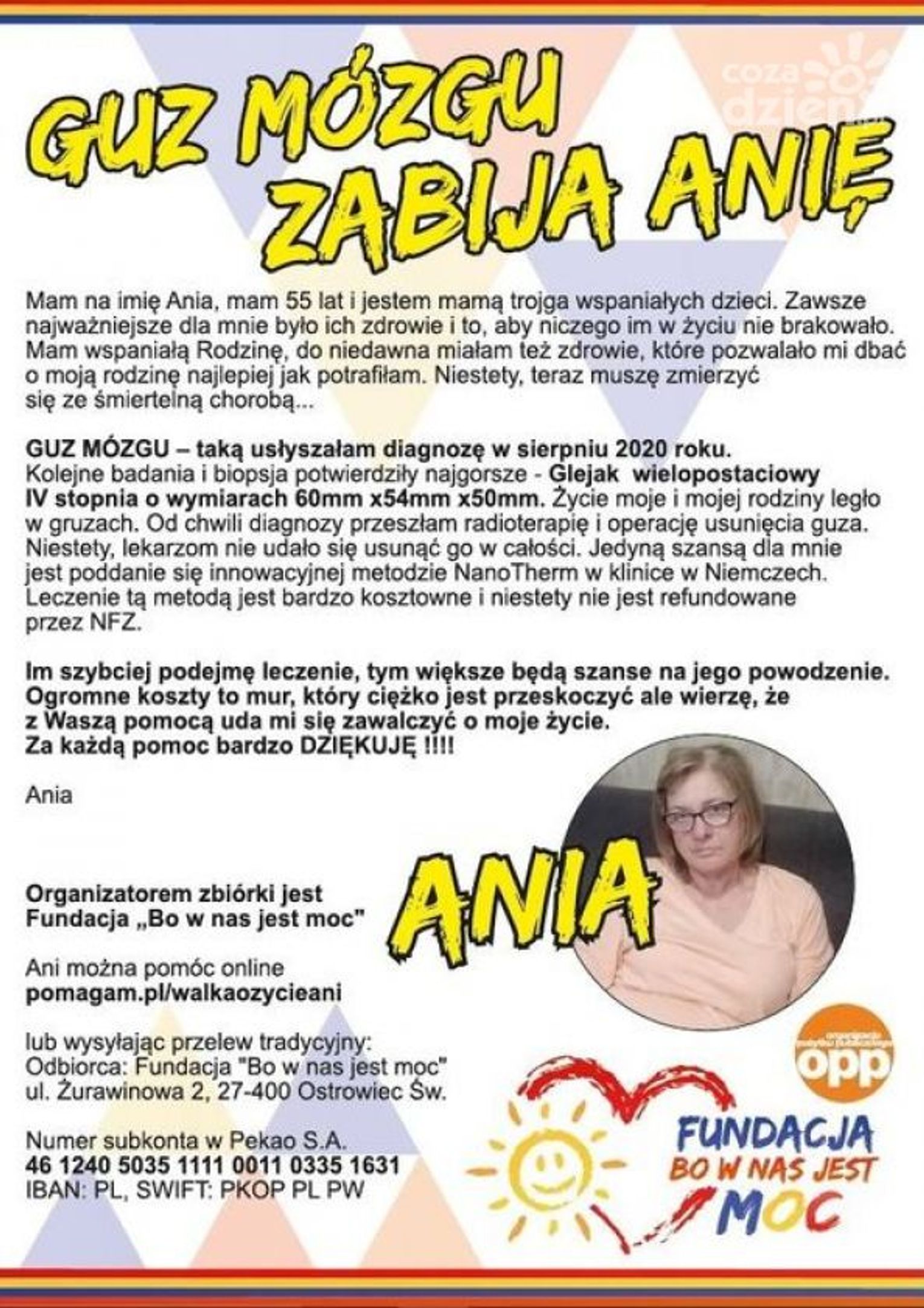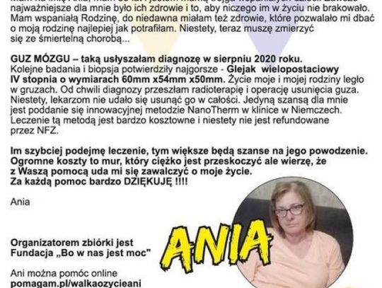 Fundacja "Bo w nas jest moc" Justyny Marynowskiej pomaga swoim podopiecznym wyjść z poważnych chorób. Wśród podopiecznych fundacji jest 55-letnia Anna z okolic Ostrowca Świętokrzyskiego. W sierpniu 2020 roku stwierdzono u niej guza mózgu. Kolejne badania i biopsja potwierdziły najgorsze, glejaka wielopostaciowego IV stopnia. Jedyną szansą na uratowanie zdrowia i życia Anny jest operacja oparta na innowacyjnej metodzie Nano Therm w klinice w Niemczech. Koszt operacji szacowany jest na ponad 250 tys. zł. Niestety, leczenie tą metodą nie jest refundowane przez NFZ. O tym jak można pomóc Annie wrócić do zdrowia i do swoich bliskich, porozmawialiśmy w porannej rozmowie Studia Lokalnego Radia Rekord na 89.6 FM z prezes fundacji, Justyną Marynowską oraz dziećmi Anny; Katarzyną i Mateuszem.